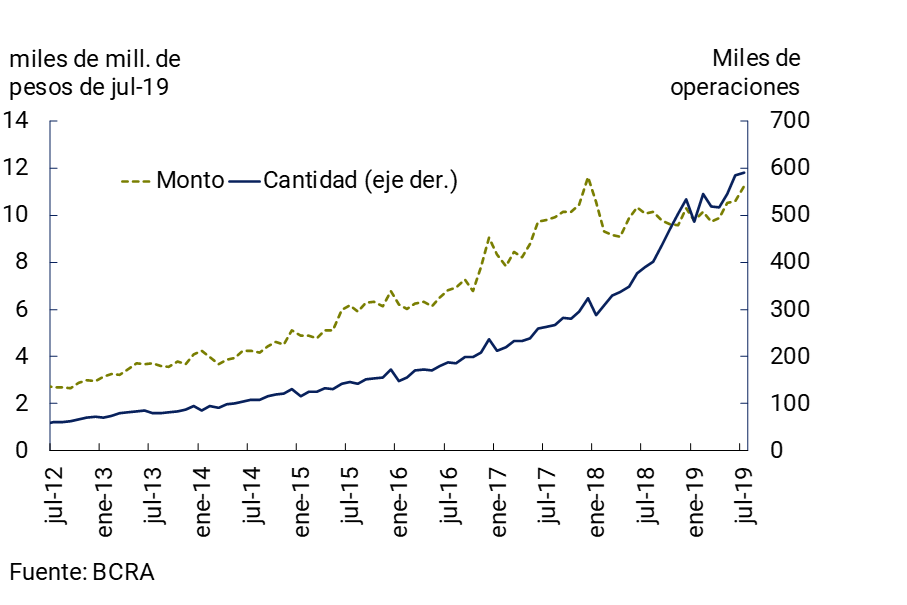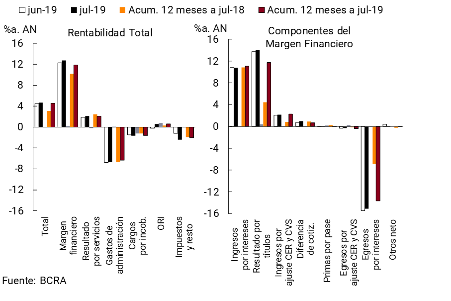 En julio los ingresos netos por servicios del sistema financiero crecieron 0,2 p.p. del activo con respecto a junio hasta 2,1%a. En el acumulado entre agosto de 2018 y julio de 2019 los bancos obtuvieron utilidades por este concepto por 2,1% del activo, 0,3 p.p. menos que un año previo.