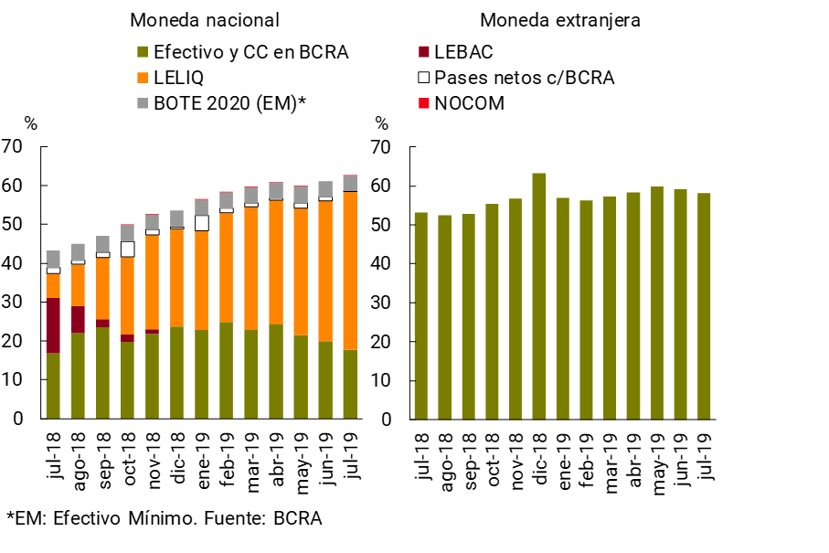 4 En julio el BCRA dispuso que la integración de los encajes en pesos se realice considerando el período bimestral julio-agosto de manera conjunta (ver Comunicación “A” 6719). Además, se dispuso incrementar en 3 p.p. la fracción de los encajes que las entidades financieras están habilitadas a integrar con LELIQ por los depósitos a plazo fijo (ver Comunicación “A” 6738).