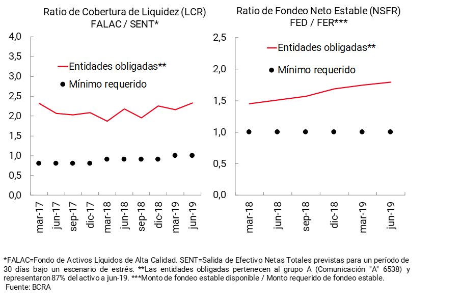 Los indicadores de liquidez que surgen de las recomendaciones internacionales (según el Comité de Basilea) se mantuvieron elevados. Considerando la última información disponible para las entidades obligadas,5 a junio de 2019 el Ratio de Cobertura de Liquidez (LCR por sus siglas en inglés) se ubicó en 2,3, mientras que el Ratio de Fondeo Neto Estable (NSFR por sus siglas en inglés) totalizó 1,8. Estos registros siguieron superando los mínimos exigidos (ver Gráfico 7).
