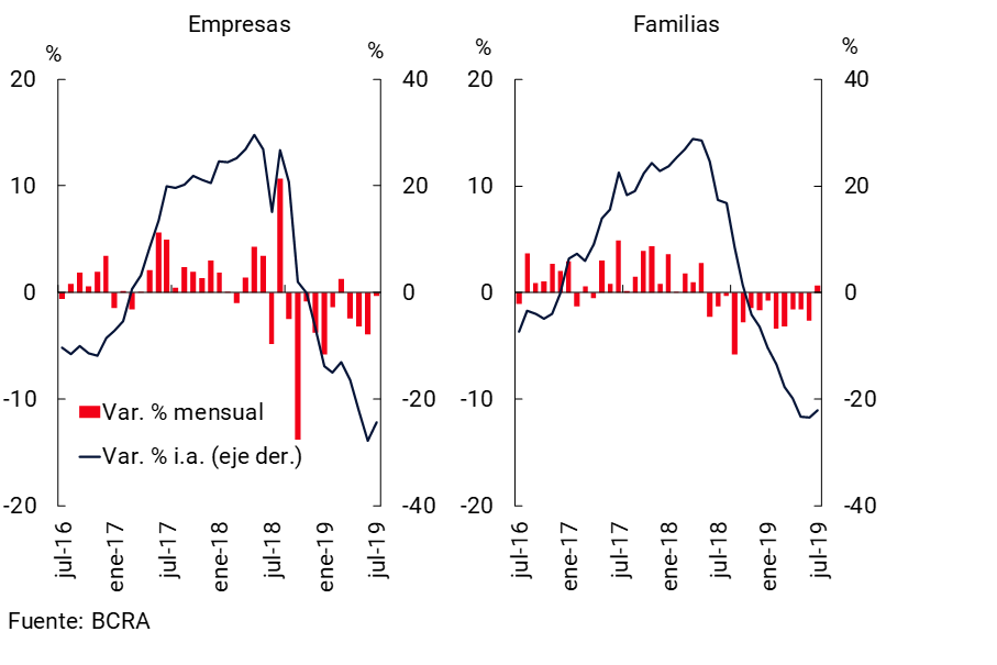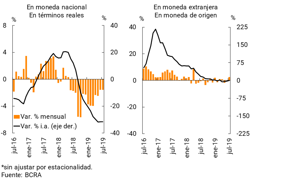 En una comparación interanual, el crédito en moneda nacional al sector privado acumuló una caída de 31,6% real en julio, mientras que el saldo de los préstamos en moneda extranjera no presentó cambios de magnitud en el período (-0,1% i.a. en moneda de origen).