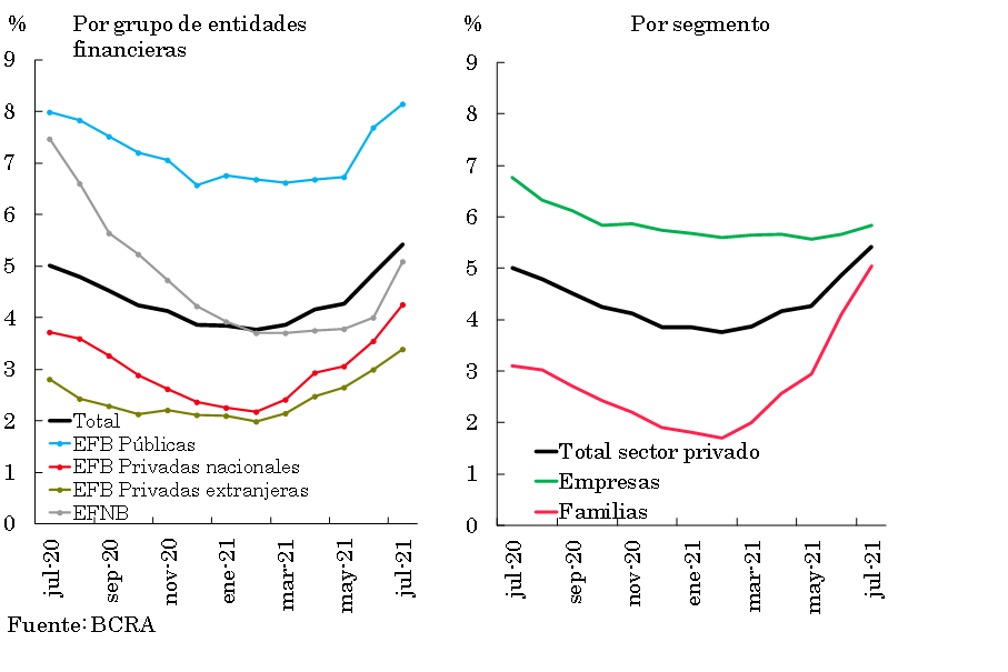 • A la fecha sigue vigente una medida de alivio financiero para los empleadores alcanzados por el REPRO II, que les permite trasladar al final de la vida del crédito las cuotas impagas de las asistencias tomadas. En este marco, el ratio de irregularidad del crédito al sector privado para el sistema financiero agregado ascendió a 5,4% en julio, 0,6 p.p. por encima del registro del mes anterior (+0,4 p.p. i.a.). La dinámica reciente de este indicador es consistente con el levantamiento gradual de las medidas extraordinarias implementadas en el marco de la pandemia (modificación transitoria de los parámetros de clasificación y el resto de las medidas de alivio financiero), tendientes a mitigar el impacto adverso del contexto sobre la situación crediticia de las personas deudoras.