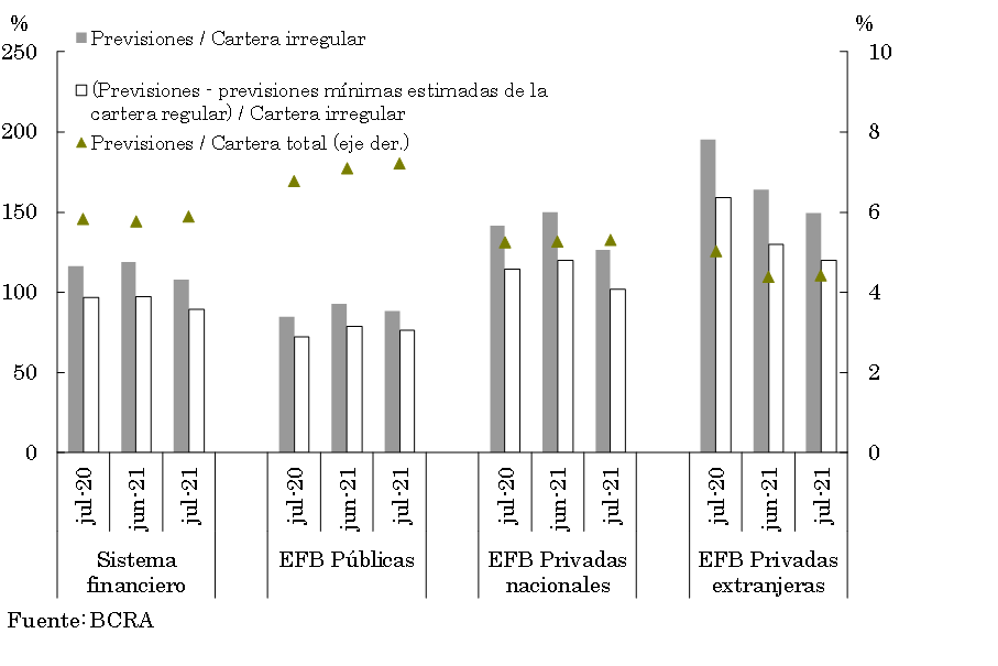 A nivel agregado las previsiones representaron 5,8 % del crédito total al sector privado en julio, 0,2 p.p. por encima del mes anterior y en línea con el registro de julio de 2020 (ver Gráfico 12). Las previsiones totales en términos de la cartera irregular se ubicaron en 107,7% en el mes (-11,5 p.p. mensual y -8,7 p.p. i.a.). Por su parte, el saldo de previsiones regulatorias atribuibles a la cartera irregular (siguiendo los criterios de las normas de previsiones mínimas regulatorias por riesgo de incobrabilidad) representó 89,2% de dicha cartera para el agregado de entidades en julio.