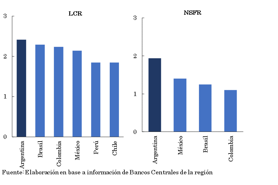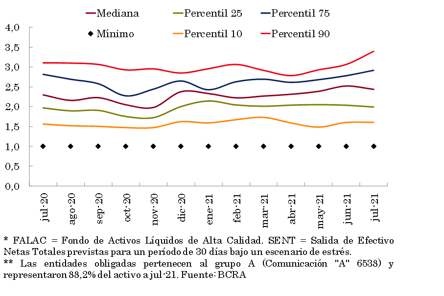 • Los ratios de liquidez del sistema financiero aumentaron en julio. El indicador amplio de liquidez se ubicó en 67,6% de los depósitos totales a nivel agregado (64,1% para el segmento en pesos y 83,2% para las partidas en moneda extranjera), 1,3 p.p. por encima tanto del nivel registrado en junio pasado como en julio de 2020. Los niveles elevados para los indicadores de liquidez en relación al promedio de los últimos 15 años se deben en parte al efecto de la esterilización de la emisión monetaria (por medio de la colocación de LELIQ y pases a las entidades financieras) llevada a cabo en 2020 luego de la emisión de pesos para asistir al PEN en los programas que buscaron moderar los efectos económicos adversos del contexto de pandemia. El conjunto de entidades continuó superando holgadamente los niveles mínimos exigidos localmente y recomendados internacionalmente para los requerimientos de liquidez que surgen del Comité de Basilea (“LCR” y “NSFR”). Los registros locales para los indicadores agregados de liquidez (“LCR” y “NSFR”) se ubican por encima del promedio de los países de la región.