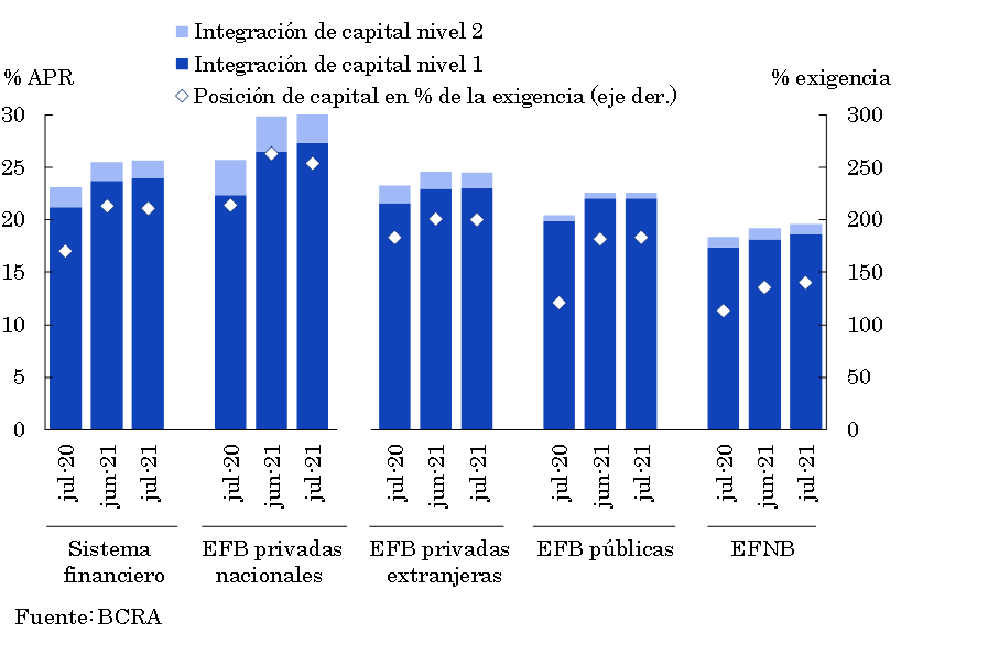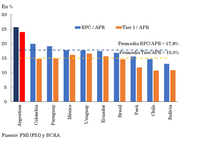 • Respecto a la solvencia del sector, en el mes aumentó levemente la integración de capital regulatorio (RPC) en términos de los activos ponderados por riesgo (APR), alcanzando 25,7% a nivel sistémico (+2,6 p.p. i.a.). La posición excedente de capital (RPC – exigencia normativa) en términos de la exigencia regulatoria totalizó 211% a nivel sistémico. El sostenimiento de elevados ratios de solvencia recoge en parte el efecto de la normativa macroprudencial implementada por el BCRA que ha contemplado la suspensión de la distribución de dividendos por parte de las entidades en el contexto de la pandemia. Estos niveles para los indicadores agregados de solvencia superan al promedio de los países de Latinoamérica.