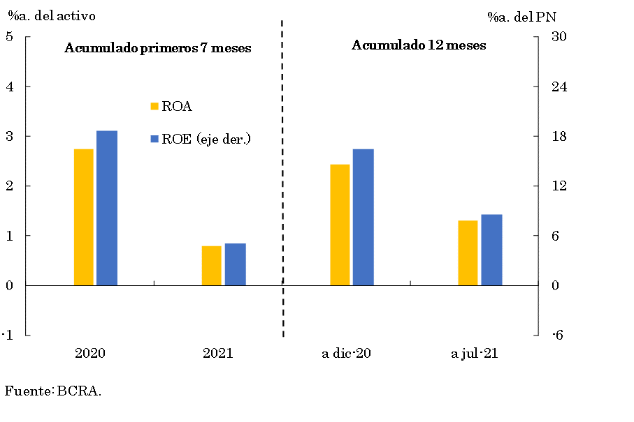 • En los primeros 7 meses de 2021 los resultados totales integrales en moneda homogénea del sistema financiero alcanzaron 0,8% del activo (ROA) y 5,1% del patrimonio neto (ROE). Si bien en el margen se observó cierta recomposición en los indicadores de rentabilidad del sector, la rentabilidad acumulada en el año resulta inferior a la evidenciada en el mismo período de 2020.