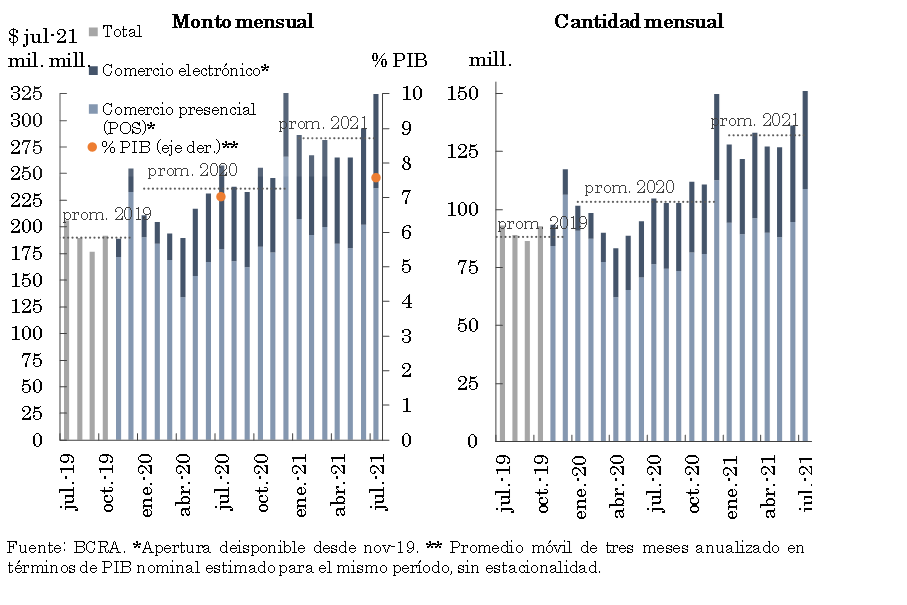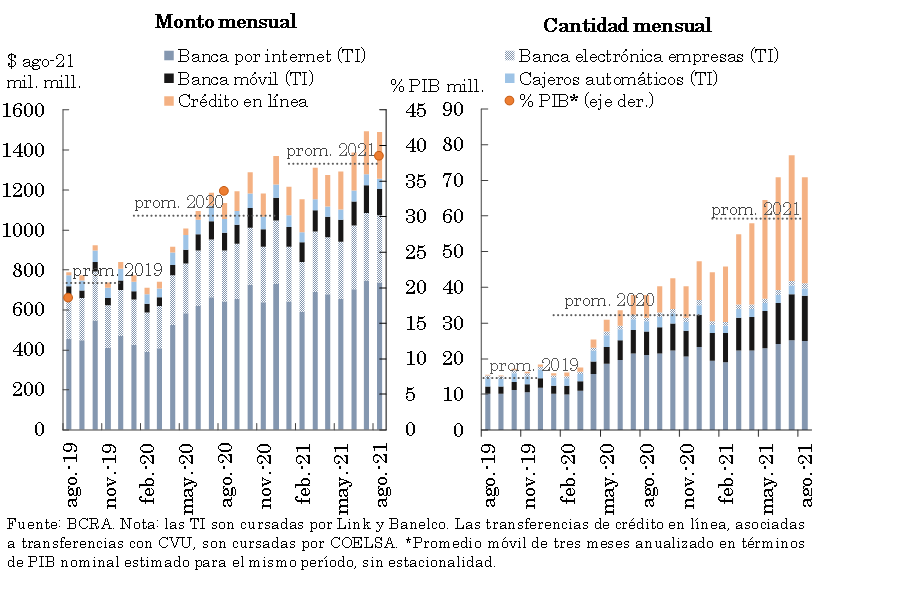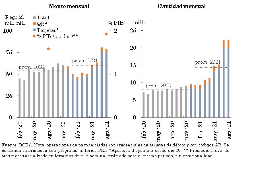 En lo que va de 2021 los medios electrónicos de pago crecieron a un ritmo destacado, acompañando el sendero de creciente demanda por parte de la población —proceso que se profundizó en el escenario de pandemia— así como el impuso de las medidas oportunamente implementadas por el BCRA.