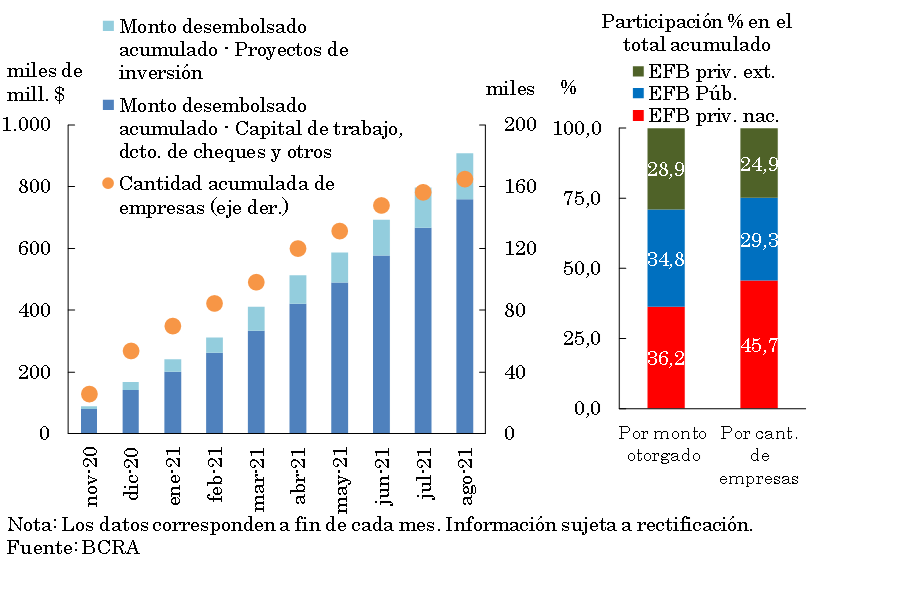 Paralelamente, en el marco de la línea de financiamiento a tasas de interés subsidiadas para empresas inscriptas en el “Programa de Asistencia de Emergencia al Trabajo y la Producción” (ATP),5 hasta fines de agosto se llevan otorgados más de 20.900 préstamos por un total de $14.266 millones.