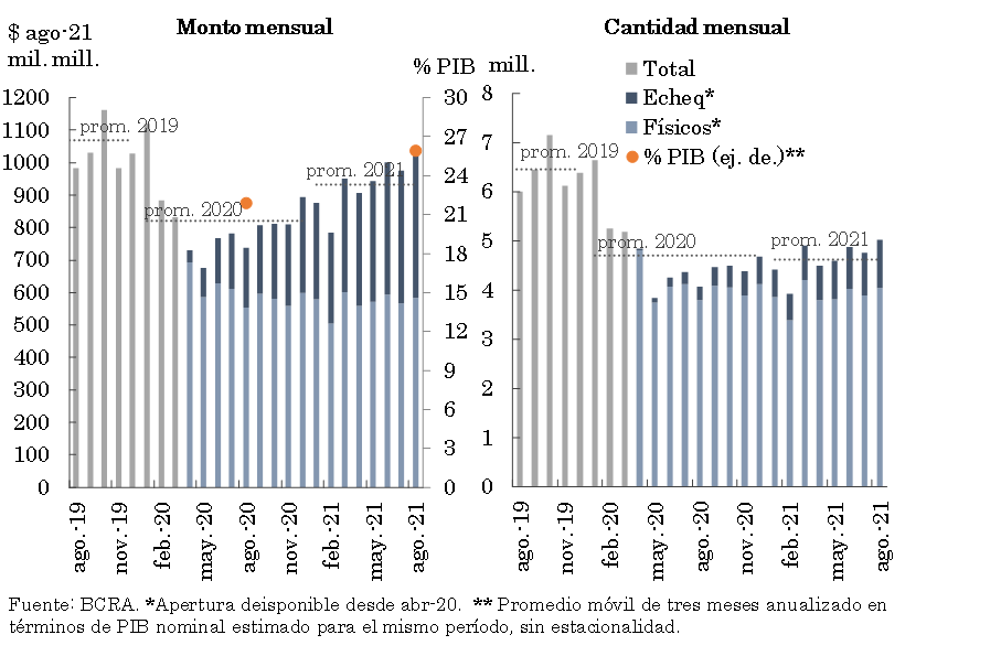 • En lo que va del año los medios electrónicos de pago se expandieron a un ritmo destacado, acompañando el sendero de creciente demanda por parte de la población, así como el impuso de las medidas oportunamente implementadas por el BCRA. En particular, el monto operado mediante transferencias en línea acumuló un incremento de 29,6% real en los últimos 12 meses a agosto. Por su parte, el aumento interanual en la compensación de cheques estuvo explicado prácticamente en su totalidad por los ECHEQs (llegando a ponderar cerca de 40% del monto compensado en agosto).