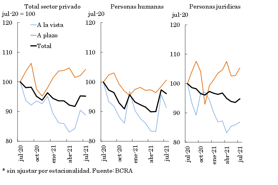 • En julio el saldo de los depósitos en pesos del sector privado permaneció sin cambios significativos en términos reales respecto al anterior (+2,9% nominal). Las cuentas a la vista disminuyeron 1,8% real (+1,2% nominal), mientras que los depósitos a plazo se incrementaron 2,1% real (+5,1% nominal). Los depósitos a plazo fijo UVA del sector privado crecieron 3,3% real en el mes (5,1% real para aquellos con cancelación anticipada y 2,4% real para los tradicionales).