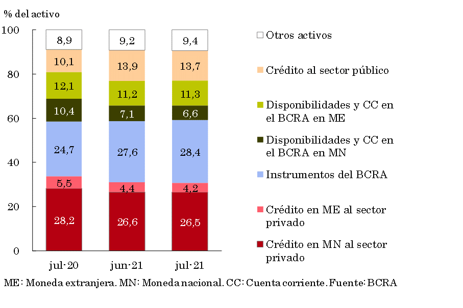 Respecto a los componentes del activo total del sector, en julio ganó ponderación la tenencia de instrumentos del BCRA (ver Gráfico 6). Por su parte, los rubros que más disminuyeron su importancia relativa dentro del activo con respecto a junio fueron los recursos líquidos en pesos depositados en cuenta corriente en el BCRA, el crédito en moneda extranjera al sector privado y el financiamiento al sector público.