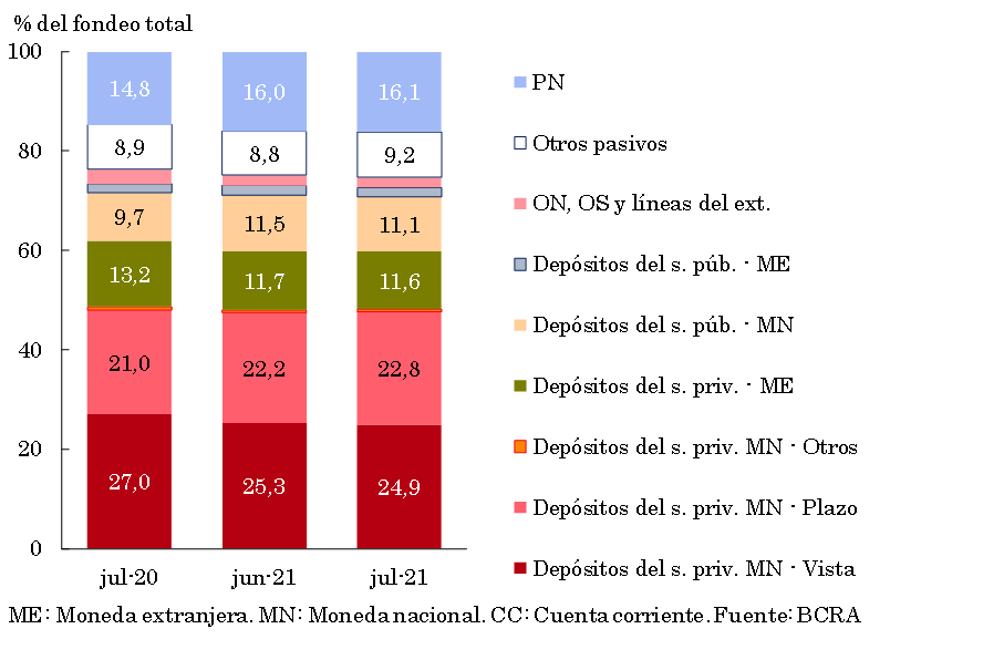 Con relación a la composición del fondeo bancario, en julio los movimientos más destacados a nivel sistémico fueron, por un lado, el aumento de la participación de los depósitos a plazo en moneda nacional del sector privado, y por el otro, la caída de la importancia relativa de las cuentas a la vista en pesos de dicho sector y de los depósitos en moneda nacional del sector público (ver Gráfico 7).