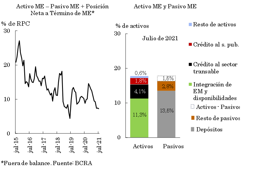 Los activos en moneda extranjera del conjunto de entidades financieras representaron 17,8% del activo total en julio, disminuyendo 0,2 p.p. con respecto a junio y 2 p.p. en comparación con el nivel de un año atrás. Los pasivos en igual denominación registraron un desempeño similar (-0,2 p.p. mensual y -2,3 p.p. iba.), ponderando 16,3% del fondeo total (pasivo y patrimonio neto) en el período (ver Gráfico 8). Considerando además las operaciones de compra y venta a término de moneda extranjera —clasificadas fuera de balance—, el diferencial entre activos y pasivos en dicha denominación del sistema financiero agregado representó 7,2% del capital regulatorio en julio, reduciéndose tanto en términos mensuales como interanuales (-0,2 p.p. y -1,6 p.p. respectivamente).