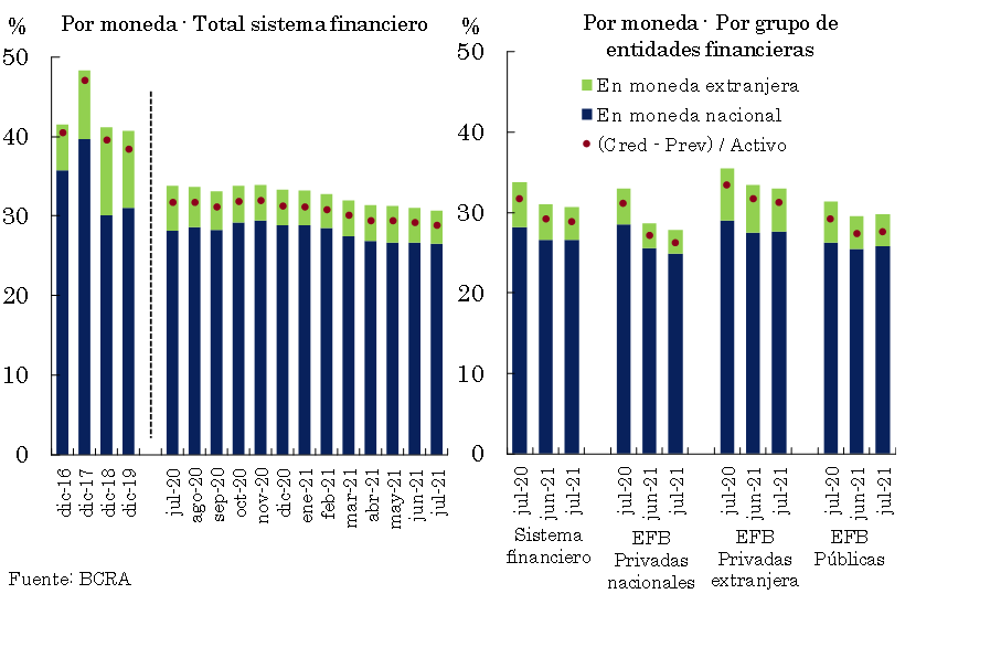Adicionalmente, en julio a nivel agregado la relación entre la posición excedente de capital y el crédito al sector privado neto de previsiones17 se ubicó en 31,9%, 7 p.p. por encima del registro de un año atrás (superando holgadamente al promedio de los últimos 10 años —13,7%—).