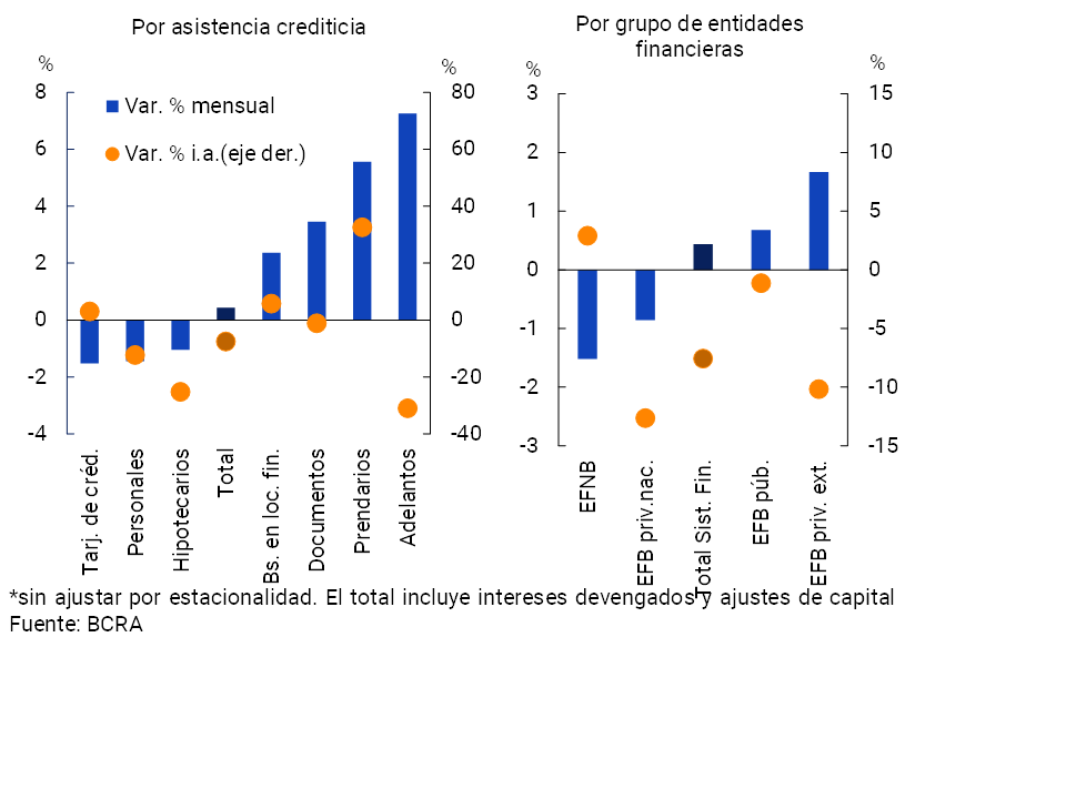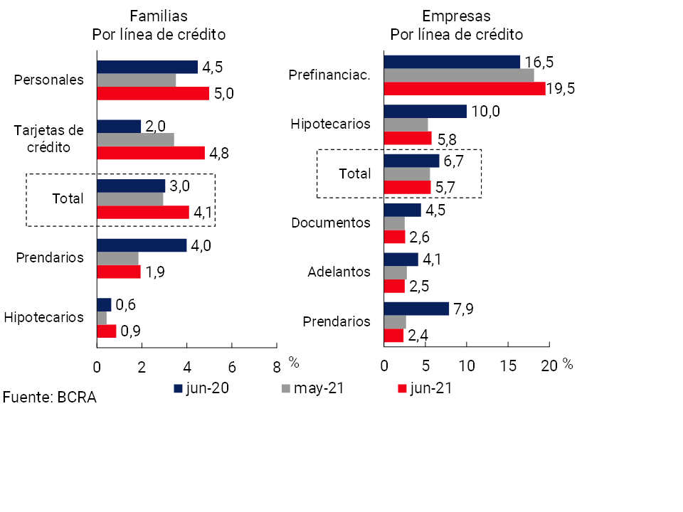 • En junio el saldo de crédito en pesos al sector privado aumentó 0,4% real (+3,6% nominal), reflejado principalmente en las líneas comerciales y en prendarios. Este desempeño mensual fue en parte explicado por la Línea de Financiamiento para la Inversión Productiva (LFIP) de MiPyMEs, mediante la cual se llevan otorgados cerca de $796.850 millones hasta fines de julio.