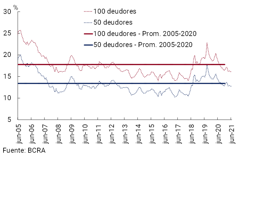 La participación de las principales personas (jurídicas y humanas) deudoras en la cartera total de créditos del sistema financiero continuó descendiendo en lo que va de 2021. En particular, las 100 y 50 principales personas deudoras del sector privado14 representaron 16,1% y 12,7% del saldo total de créditos en el agregado del sistema financiero a junio (ver Gráfico 10), 2,4 p.p. y 1,5 p.p. por debajo del mismo mes del año anterior, respectivamente. Los niveles actuales para estos indicadores se ubicaron por debajo del promedio de los últimos 16 años, reflejando una moderada concentración de las personas deudoras del sector privado en el sistema financiero15.