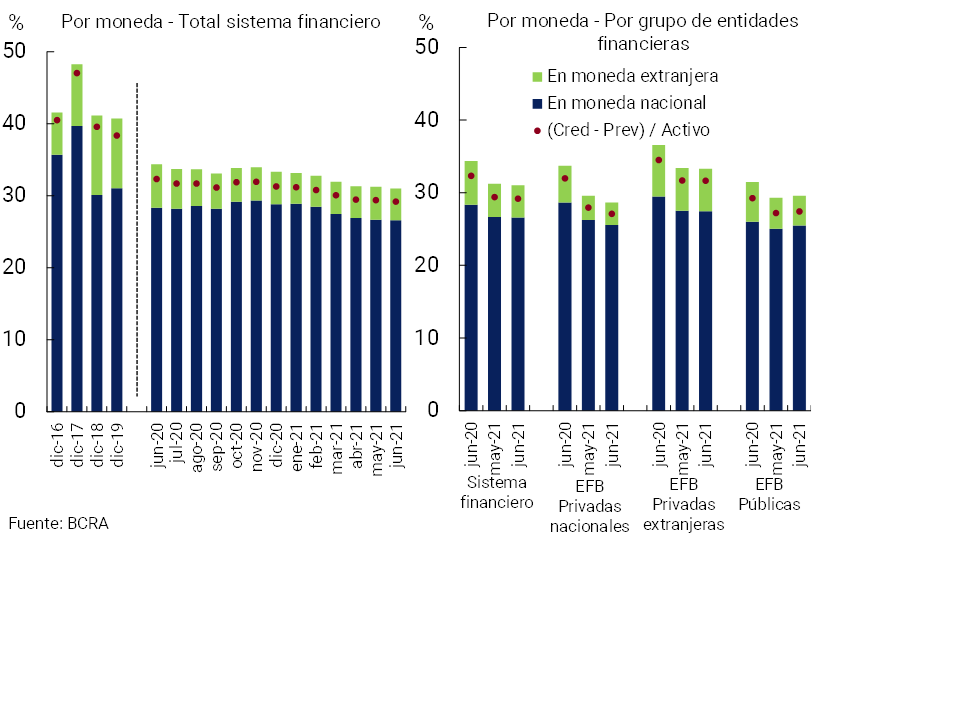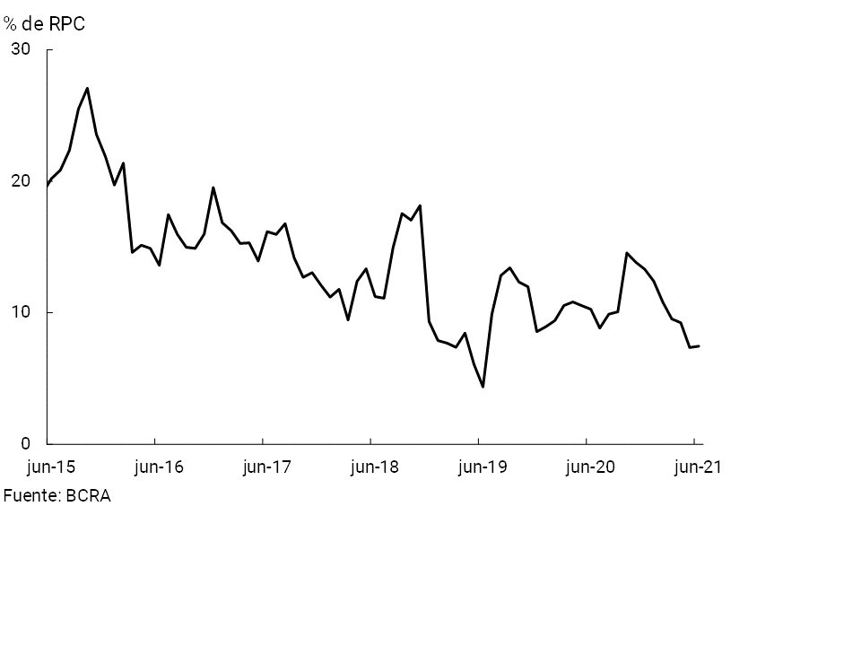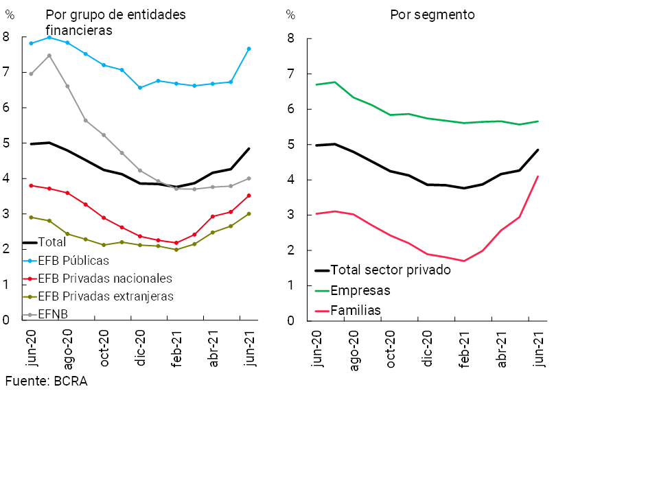 • En línea con la reactivación económica, el BCRA se focalizó en medidas de alivio orientadas en particular a la población más afectada por la pandemia. En junio finalizó el esquema transitorio que permitía incrementar los plazos de mora para clasificar a las personas deudoras en situación 1, 2 y 3 (60 días hasta el 31/03/2021 y 30 días hasta el 31/05/2021), retomando así a los criterios que se utilizaron hasta el 19/03/2020. Al momento continúa vigente una medida de alivio financiero para las personas deudoras que sean empleadores y empleadoras alcanzados por el programa REPRO II, que les da la posibilidad de trasladar al final de la vida del crédito las cuotas impagas de las asistencias tomadas. En ese contexto, el ratio de irregularidad del crédito al sector privado alcanzó 4,8% en el mes, 0,6 p.p. más que en mayo (levemente por debajo en una comparación interanual), desempeño reflejado en todos los grupos de entidades.