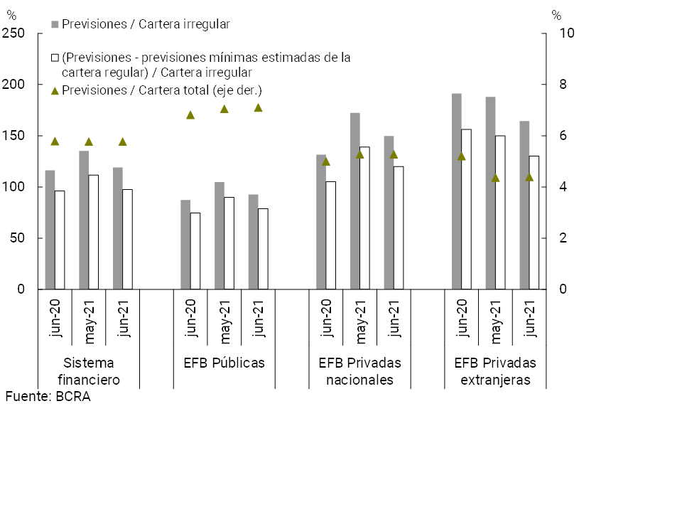 A mediados de 2021 las previsiones totales del sistema financiero agregado representaron 5,8% del crédito total al sector privado, en línea con el registro de mayo y con el de junio de 2020 (ver Gráfico 13). Las previsiones totales en términos de la cartera irregular se ubicaron en 119% en el mes a nivel sistémico (-16,3 p.p. mensual y +2,7 p.p. i.a.). Por su parte, en junio el saldo de previsiones regulatorias atribuibles a la cartera irregular (siguiendo los criterios de las normas de previsiones mínimas regulatorias por riesgo de incobrabilidad) representó 97,4% de dicha cartera para el agregado de entidades.