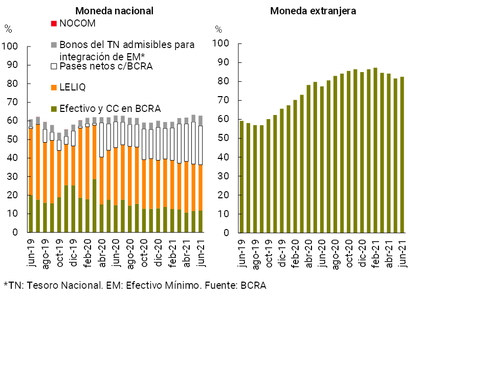 18 En junio entró en vigencia la normativa que permite a las entidades financieras integrar con títulos públicos nacionales en pesos (excluyendo aquellos vinculados a la cotización del dólar) adquiridos por suscripción primaria, con plazo residual no inferior a 180 días y no mayor a 450 días, la porción de la exigencia de efectivo mínimo que puede verificarse con LELIQ (para mayor detalle, ver Comunicación “A” 7290″). Cabe considerar que ya desde 2018 las entidades financieras se encontraban habilitadas para integrar parte de las mencionadas exigencias con “Bonos del Tesoro Nacional en pesos a tasa fija” (con vencimiento en 2020 / 2022).
