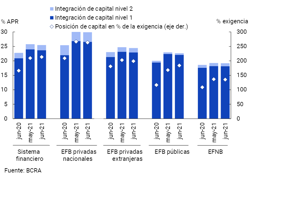 • Los indicadores de solvencia del sector cerraron el primer semestre del año en niveles holgados. La integración regulatoria de capital (RPC) a nivel agregado se ubicó en 25,5% de los activos ponderados por riesgo (APR) en junio, 2,7 p.p. superior al registro de mediados de 2020. En el mes la posición de capital (RPC menos exigencia normativa) del sistema financiero totalizó 214% de la exigencia de capital (+47 p.p. i.a.) y 31,6% del crédito al sector privado neto de previsiones (+7,4 p.p. i.a.).
