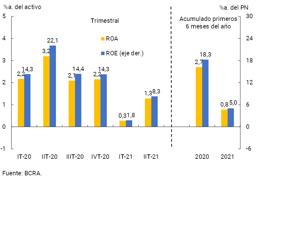 • En el primer semestre de 2021 los resultados totales integrales en moneda homogénea del sistema financiero fueron equivalente a 0,8% del activo (ROA) y 5% del patrimonio neto (ROE). Los niveles actuales de rentabilidad resultan inferiores a los evidenciados a lo largo de 2020.