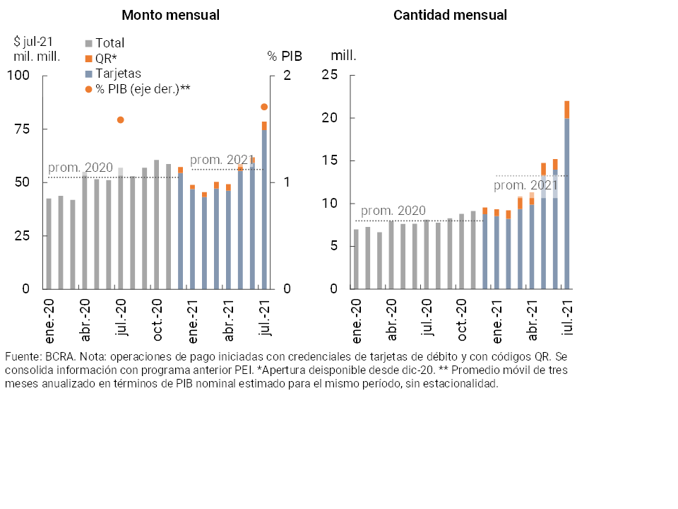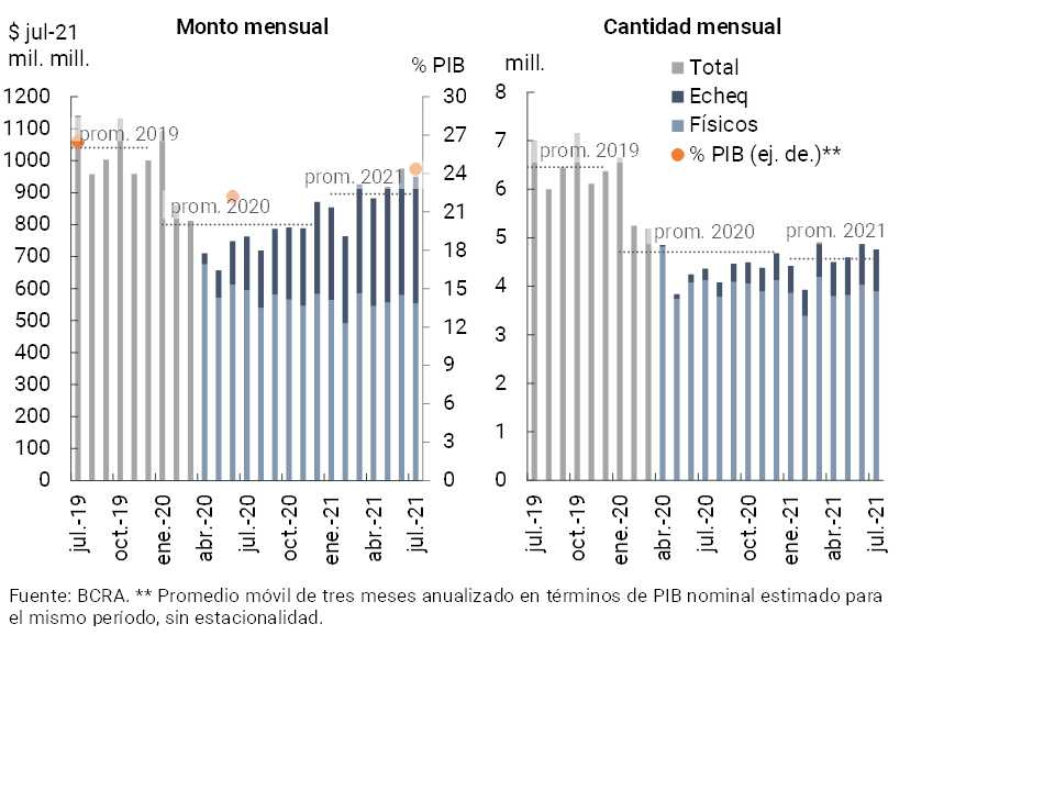 • En lo que va de 2021 los medios de pago electrónico ganaron terreno entre las operaciones de familias y empresas. En julio aumentaron nuevamente las transferencias en pesos efectuadas en línea, acumulando un incremento de 25,6% i.a. en montos reales y más que duplicándose en la cantidad de operaciones. La banca móvil sigue destacándose como el canal más dinámico entre las transferencias inmediatas. Adicionalmente, el monto de los pagos efectuados con transferencias (en el marco de la iniciativa “transferencias 3.0” implementada en diciembre de 2020 por el BCRA) creció 27,2% real en julio respecto a junio. Por otra parte, también se destaca el crecimiento de la compensación de ECHEQs, instrumento que ganó relevancia en los últimos meses hasta representar 18,2% de la cantidad de documentos compensados y 41,8% en montos operados.