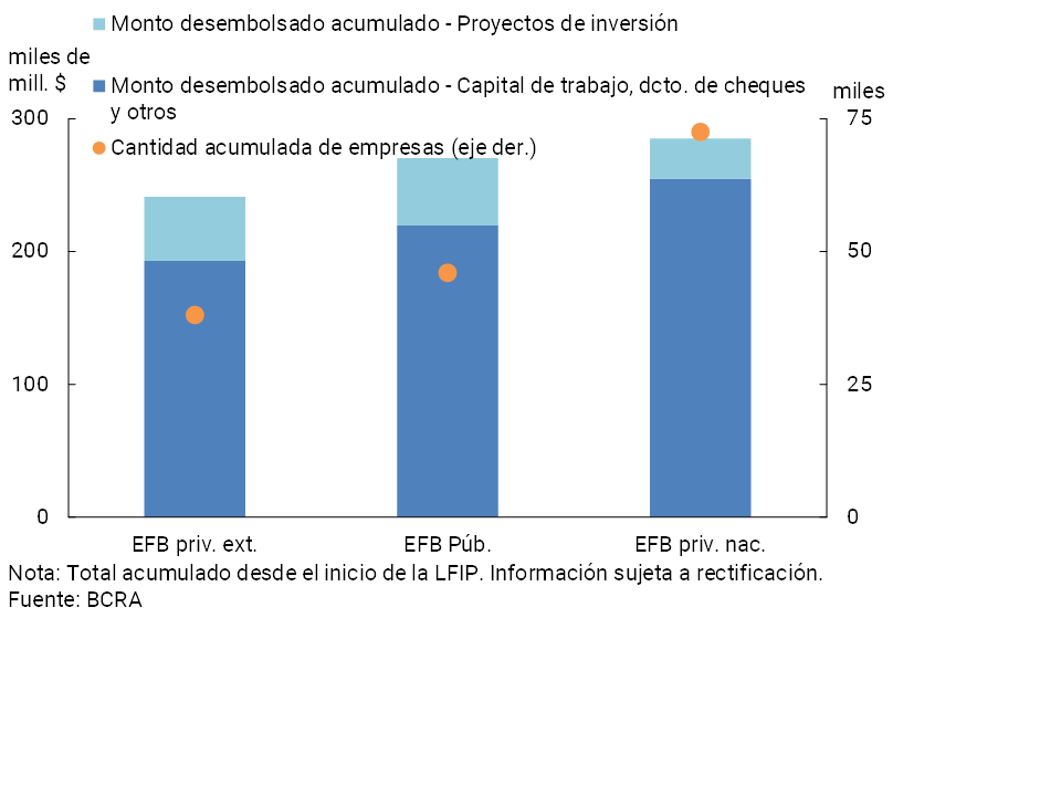 El aumento mensual de las financiaciones en pesos al sector privado fue en parte impulsado por la Línea de Financiamiento para la Inversión Productiva (LFIP) de MiPyMEs4. Desde el lanzamiento de la LFIP a mediados de octubre de 2020 y hasta fines de julio de 2021—última información disponible— se llevan otorgados cerca de $796.850 millones, distribuidos entre 156.577 empresas (Ver Gráfico 2). Las entidades financieras privadas nacionales explicaron casi el 36% del total desembolsado, seguidas por las públicas (con un 34%) y por las privadas extranjeras (con un 30%). Se estima que 84% de estos recursos fueron canalizados a financiar necesidades de capital de trabajo y a cubrir cheques de pago diferido, entre otros destinos.