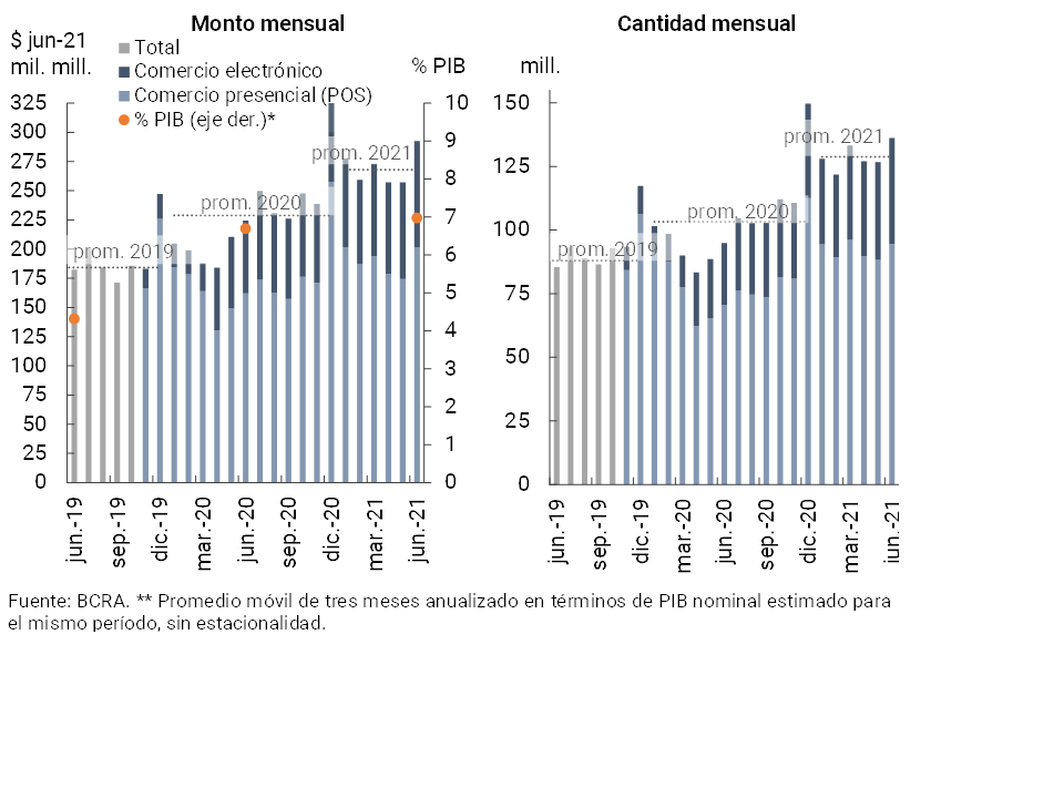 Durante junio (última información disponible) las operaciones con tarjetas de débito aumentaron respecto al mes inmediato anterior (+7,5% en cantidades y 10,4% en montos reales). Este desempeño se reflejó tanto en las operaciones electrónicas como en las presenciales24 (ver Gráfico 20). En una comparación interanual, las operaciones con tarjetas de débito crecieron en cantidades (43,6%) y en montos reales (26,5%), dinámica explicada principalmente por el formato electrónico (+72,1% en cantidades y +45,3% en montos reales). De esta manera, las operaciones en formato electrónico continuaron ganando participación en el total, hasta totalizar en junio 30,6% en cantidades y 31,1% en montos.