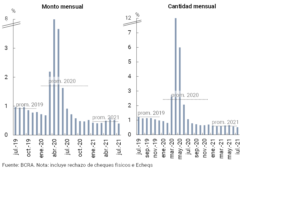 El rechazo de cheques por falta de fondos en términos del total compensado disminuyó en julio respecto a junio, tanto en cantidades (-0,06 p.p., hasta 0,52%) como en montos (-0,13 p.p., hasta 0,4%). Los niveles actuales de este ratio resultan moderados y se ubican por debajo del promedio de 2021. (ver Gráfico 22).