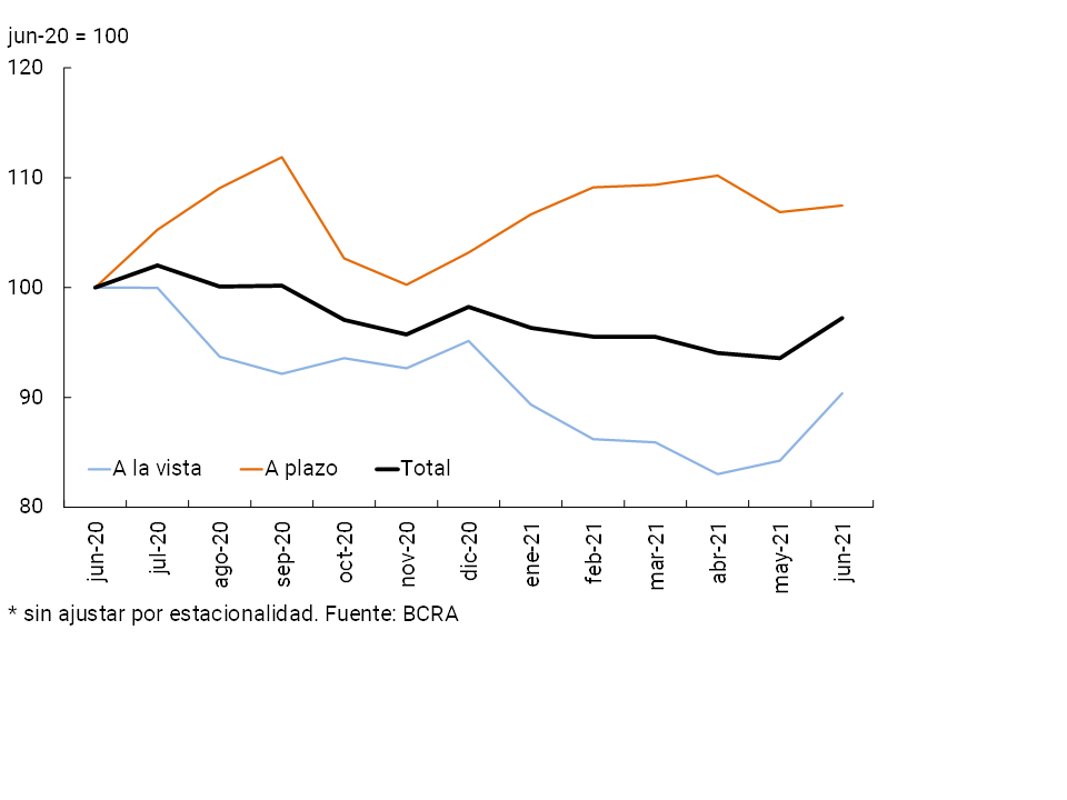 Considerando las partidas en moneda extranjera, en junio el saldo de depósitos en esta denominación del sector privado aumentó 0,4% —en moneda de origen—, impulsado principalmente por el desempeño de las entidades financieras públicas. Así el saldo de depósitos totales (incluyendo moneda nacional y extranjera) del sector privado se incrementó 2,8% real con respecto a mayo (+6,1% nominal).