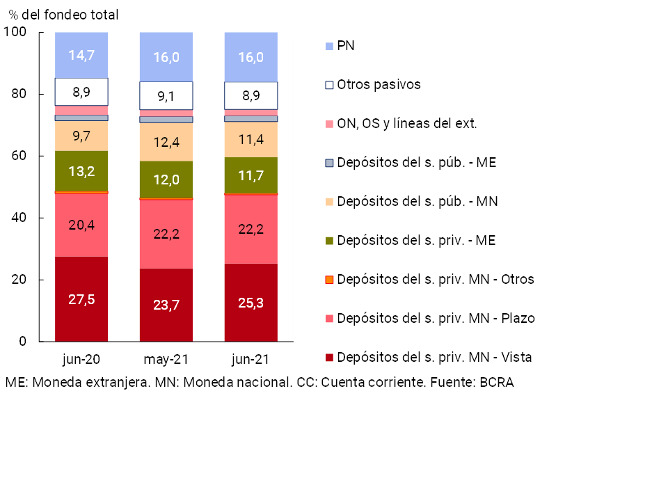Con respecto a la composición del fondeo del sistema financiero, en el mes aumentó la ponderación de las cuentas a la vista en pesos del sector privado, mientras que se verificó una caída de la ponderación los depósitos del sector público en igual denominación y de los depósitos del sector privado en moneda extranjera (ver Gráfico 7). Las restantes partidas que conforman el fondeo bancario no presentaron cambios de magnitud en el mes a nivel agregado.