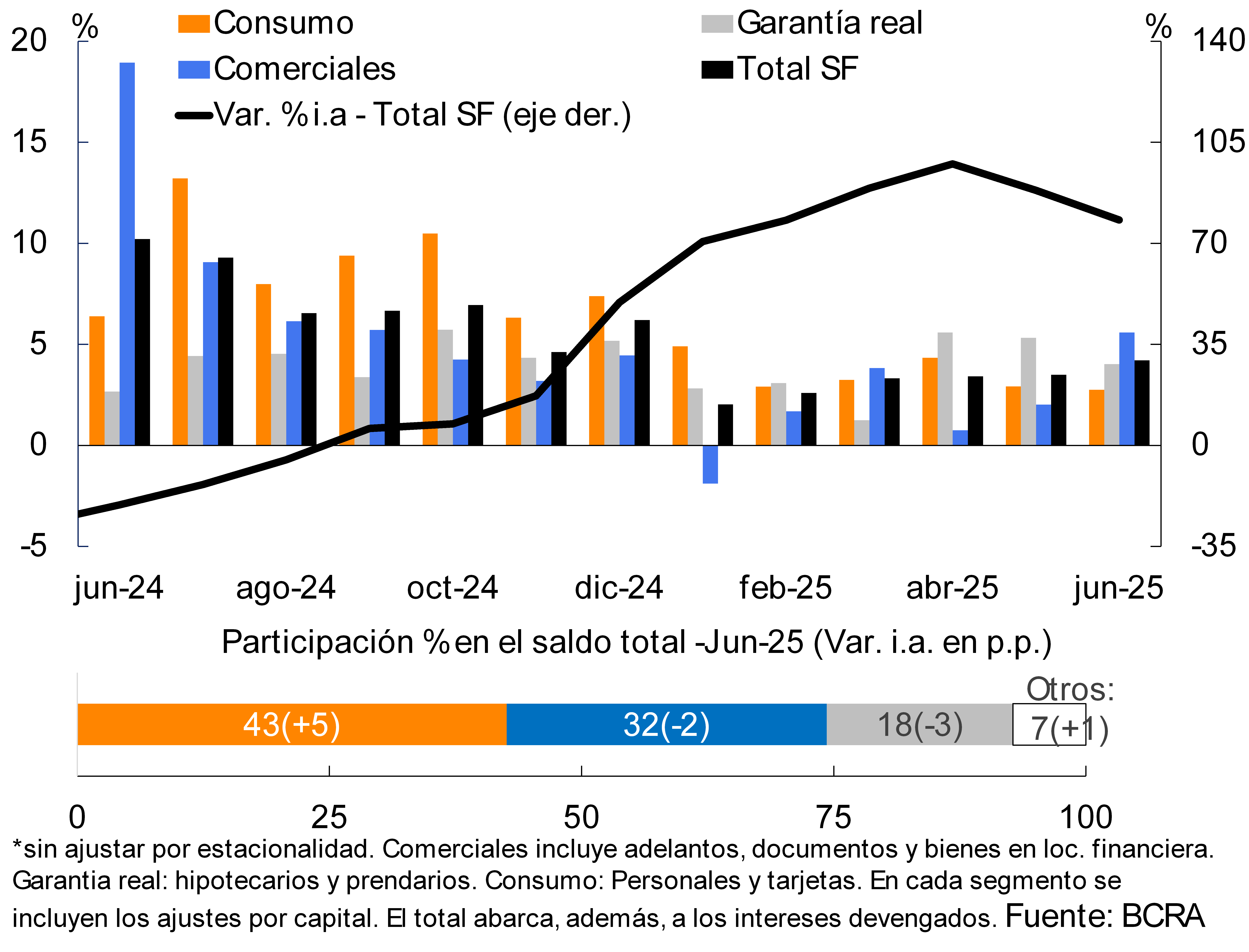 La actividad de intermediación financiera con el sector privado continuó creciendo en junio. El saldo real de crédito a empresas y familias en pesos se incrementó 4,2% en el mes (78,1% real i.a.), principalmente por las líneas comerciales y por los préstamos con garantía real. El saldo de financiamiento al sector privado en moneda extranjera aumentó 3,8% entre puntas de mes (139,8% i.a.)-variaciones en moneda de origen-.