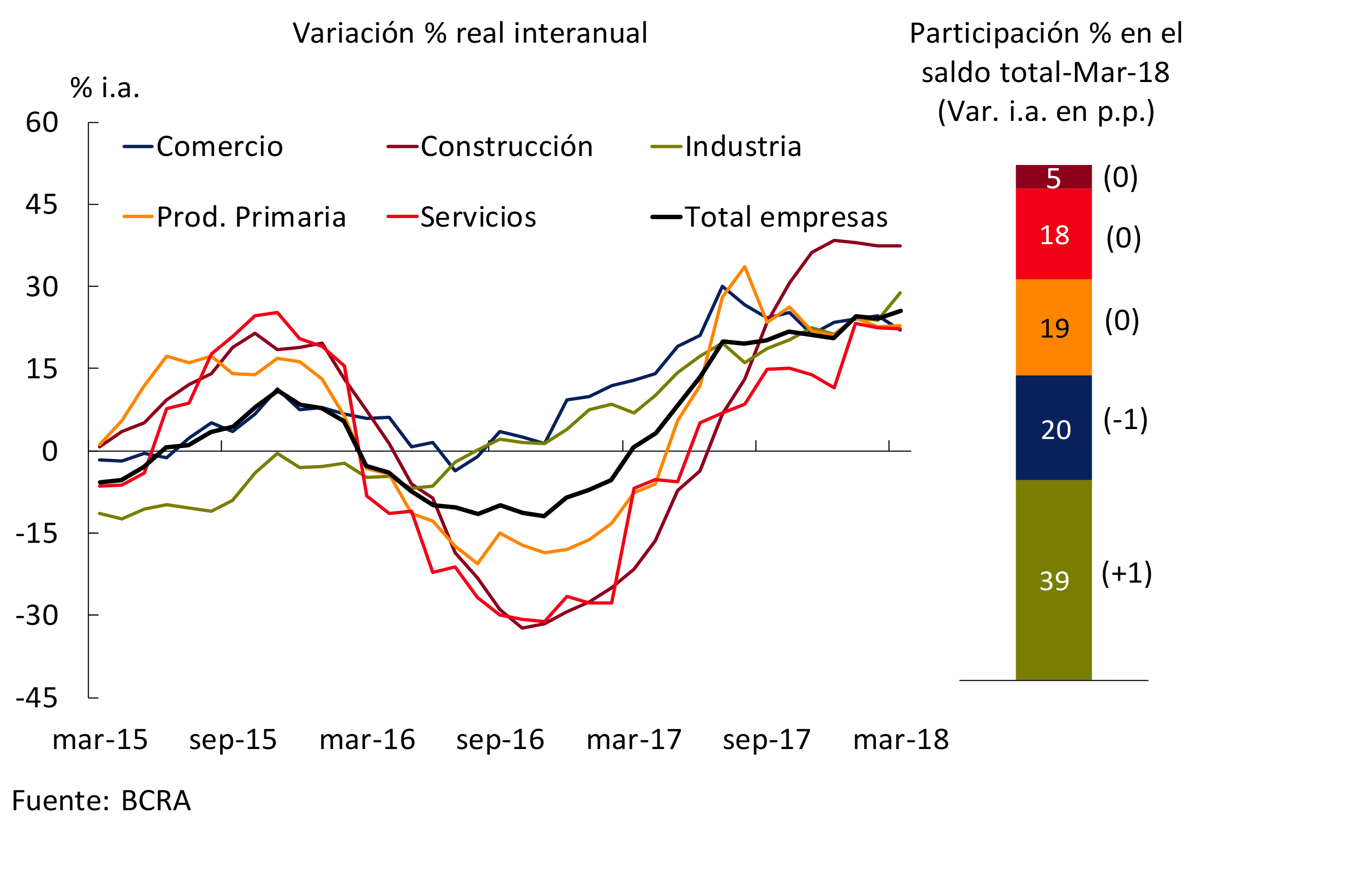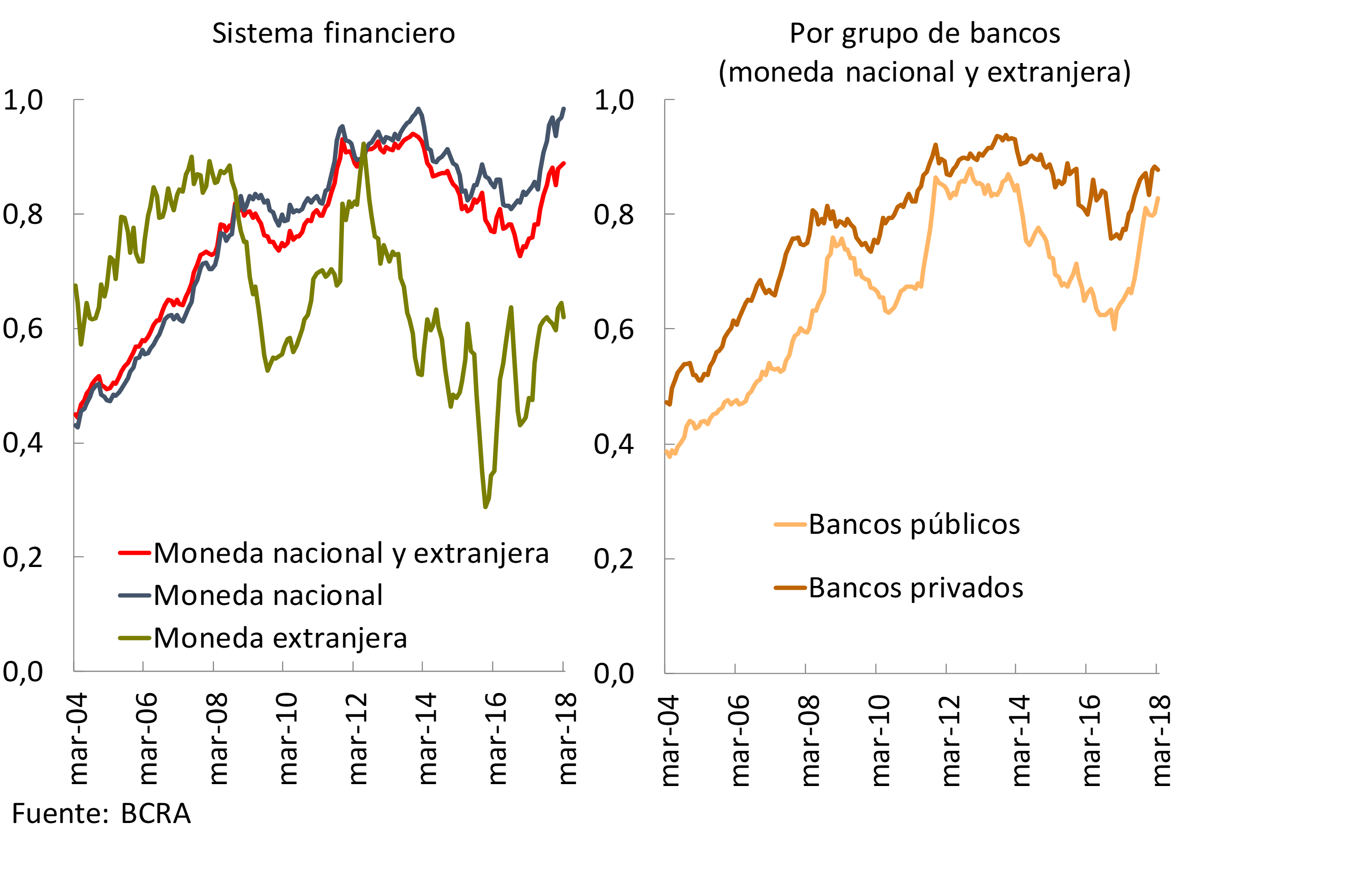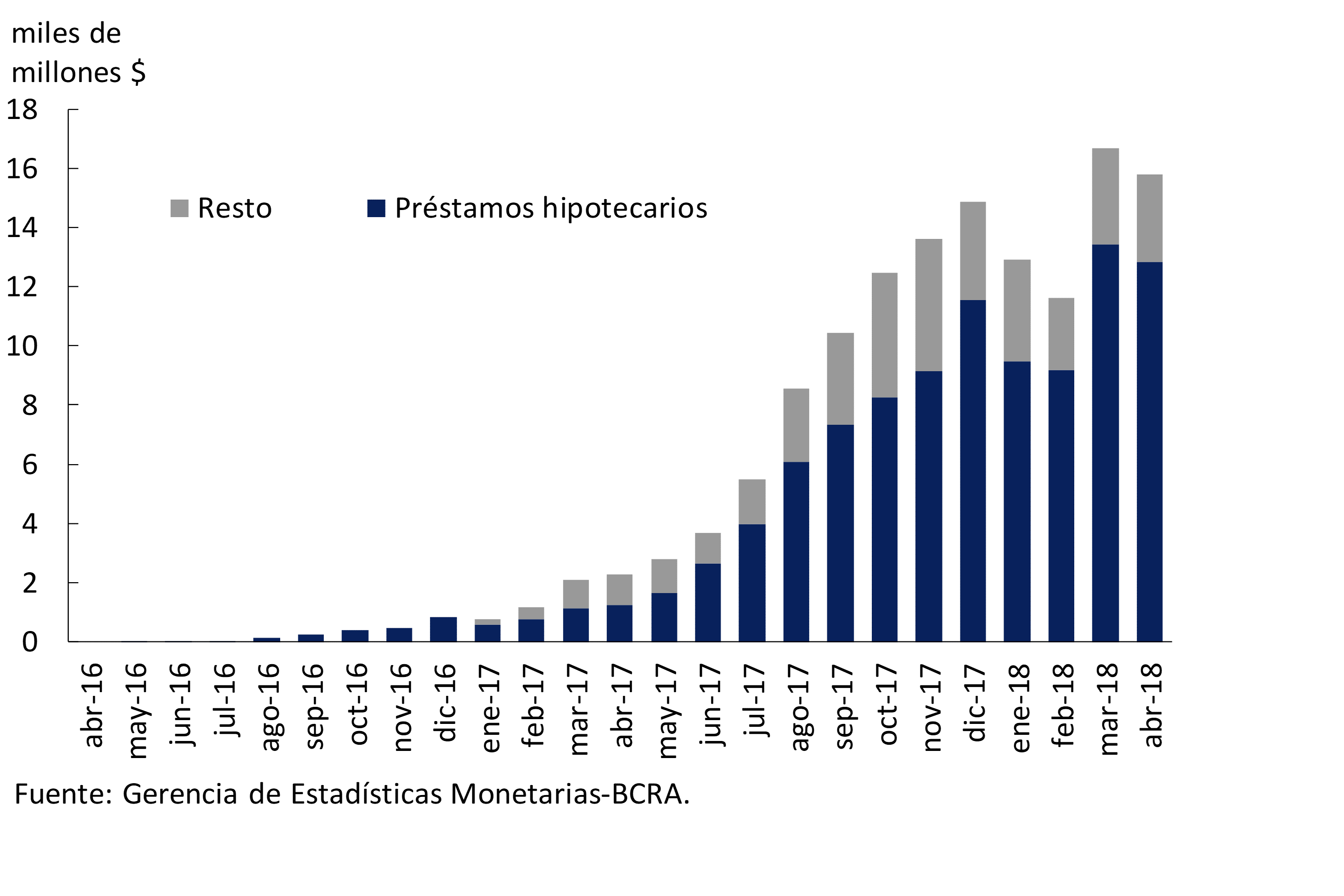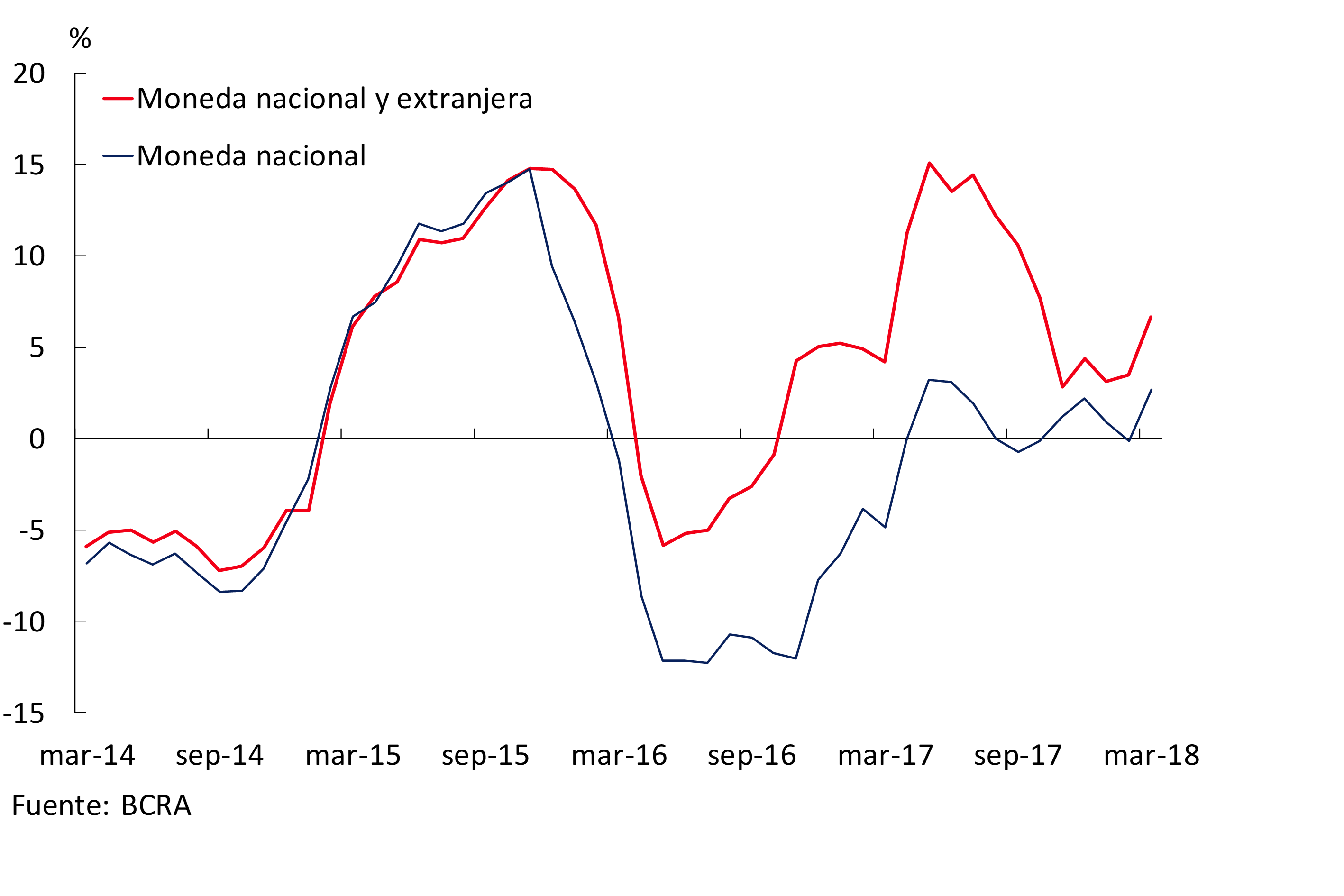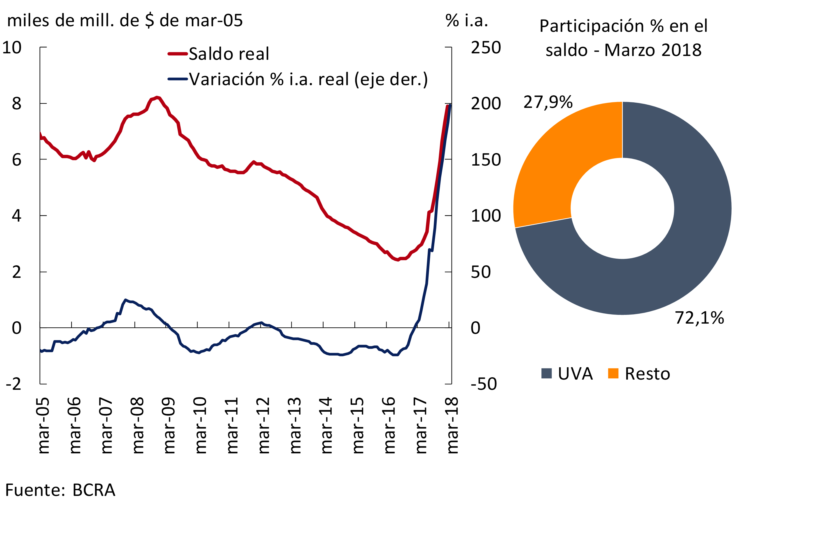 • En marzo el saldo de crédito total al sector privado creció 0,4% en términos reales con respecto a febrero, explicado por líneas en moneda nacional (+1,5% real). En términos interanuales el financiamiento total a empresas y familias acumuló un incremento real de 25,3% a marzo, 3,3 p.p. por encima del nivel del cierre de 2017. En el período el crédito en moneda extranjera aumentó 49% i.a. —en moneda de origen—, en tanto que los préstamos en pesos crecieron 20,1% i.a. real, destacándose el incremento de los préstamos hipotecarios. Los créditos hipotecarios a las familias continuaron mostrando un destacado dinamismo, casi triplicándose en términos reales en los últimos doce meses. El segmento UVA explicó el 72,1% del saldo de hipotecarios a familias a marzo de 2018.