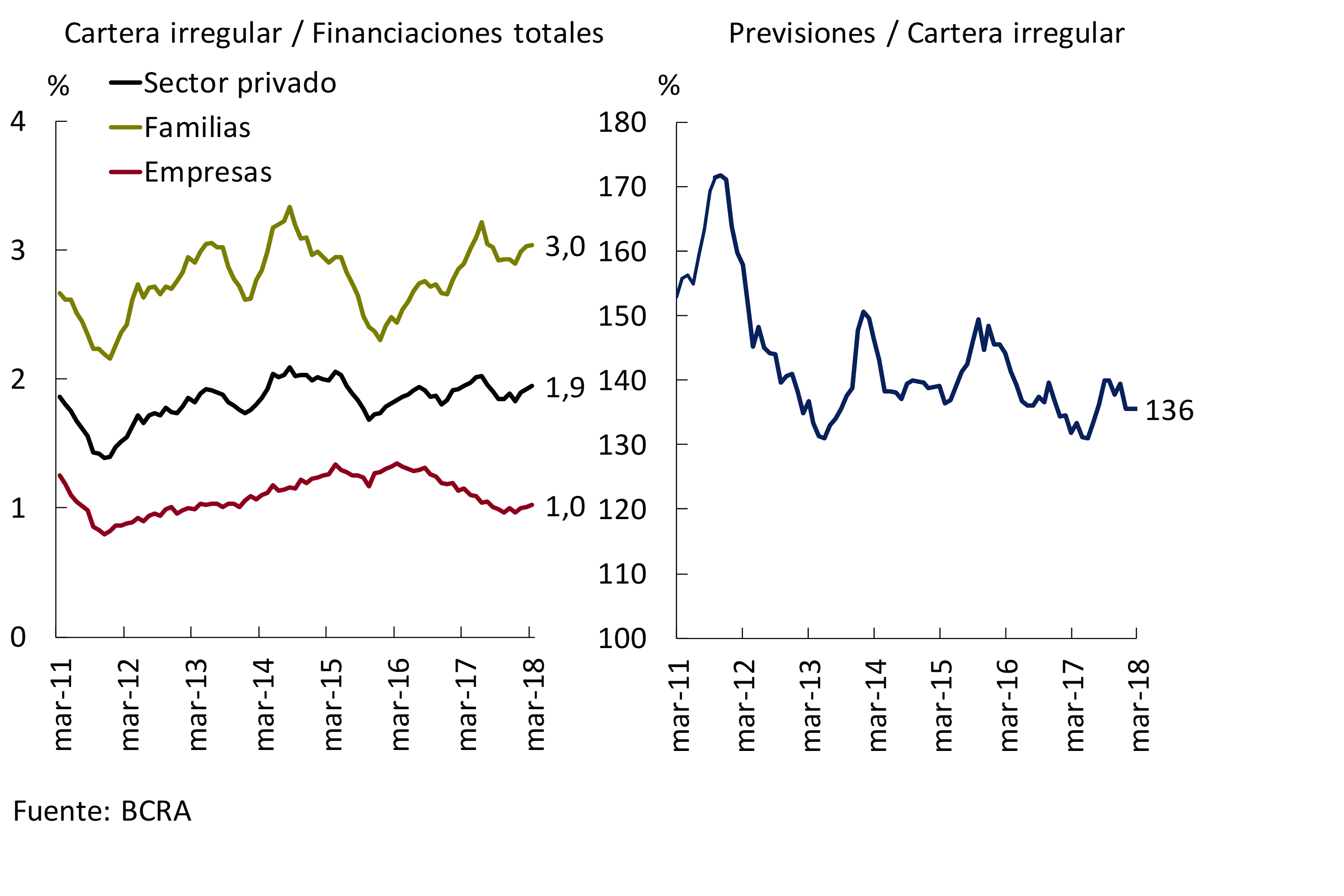 • La irregularidad del crédito al sector privado se mantuvo en 1,9% de la cartera total en marzo. El ratio de irregularidad de los préstamos a las familias se ubicó en 3%, en tanto que el de los créditos a las empresas permaneció en 1% en el período. En el cierre del primer trimestre las previsiones representaron 136% de la cartera en situación irregular.