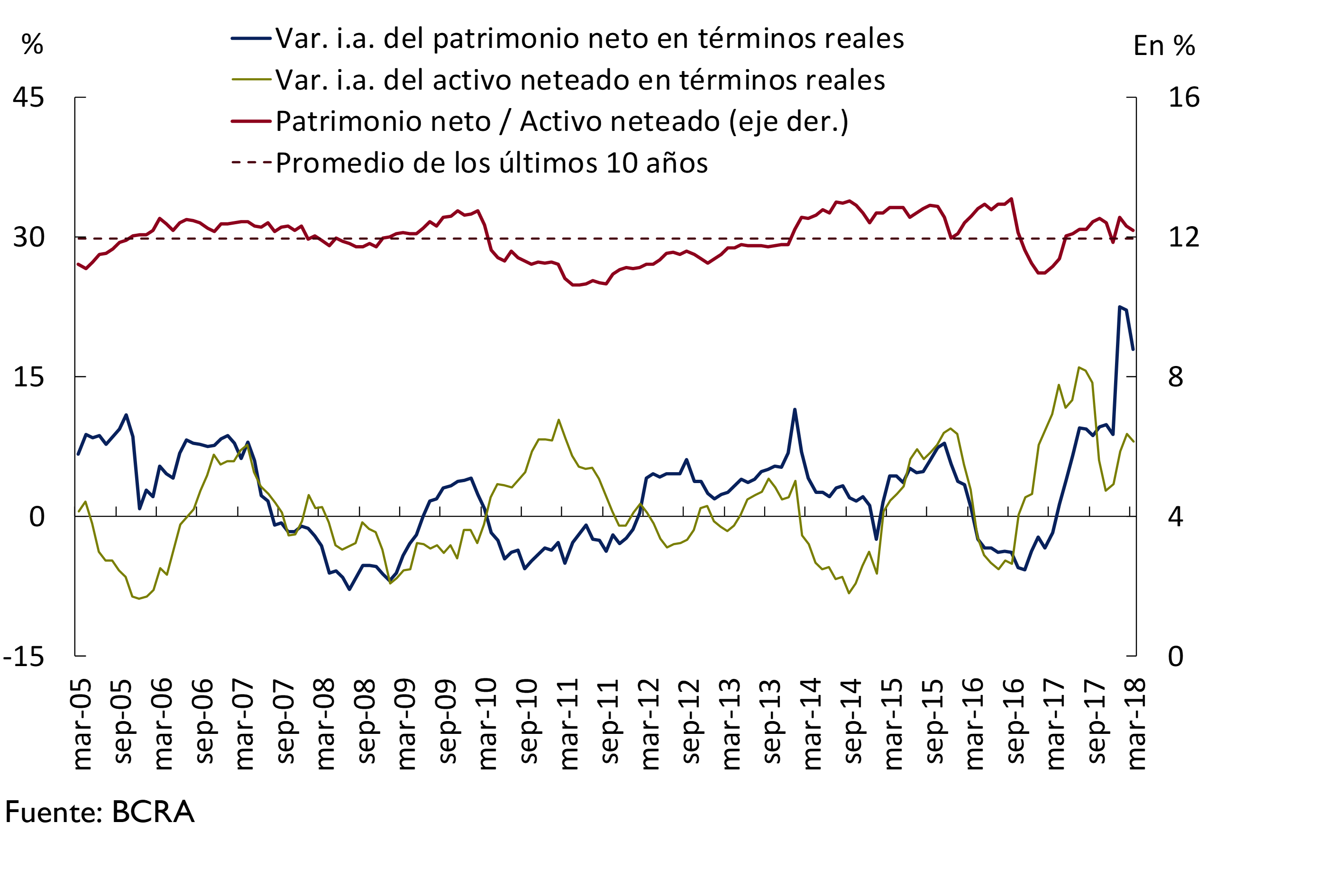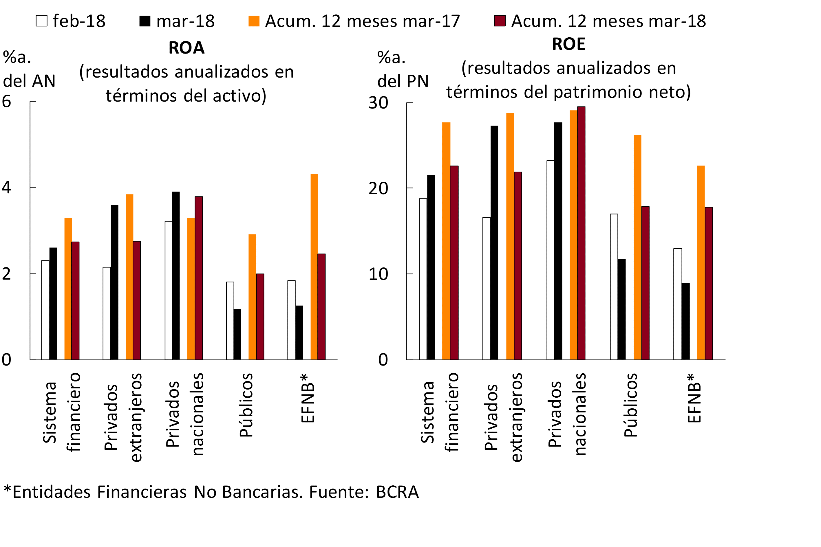 • En marzo el sistema financiero devengó ganancias equivalentes a 2,6% anualizado (a.) del activo (21,6%a. del patrimonio neto), aumentando levemente con respecto a febrero. Este incremento estuvo principalmente explicado por un mayor margen financiero, efecto compensado en parte por el desempeño de los egresos no financieros. Los bancos privados condujeron el incremento mensual de la rentabilidad nominal, mientras que los bancos públicos evidenciaron una leve caída. Considerando los resultados acumulados en 12 meses a marzo, el sistema financiero obtuvo beneficios por 2,7% del activo, 0,6 p.p. menos en una comparación interanual.