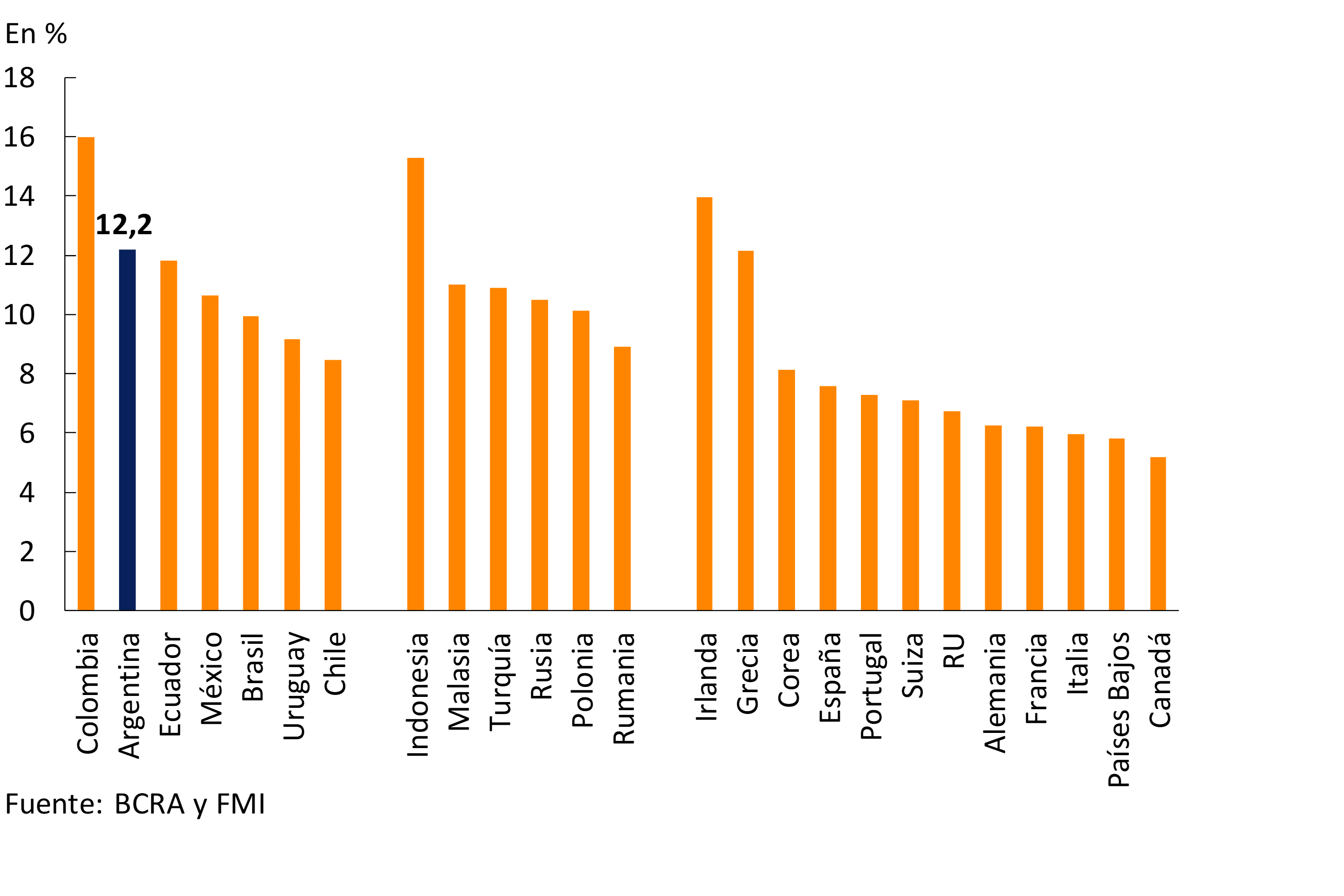 El sistema financiero cerró el primer trimestre con elevados indicadores de solvencia. El patrimonio neto del conjunto de bancos fue equivalente a 12,2% del activo total del sector a marzo de 2018 (ver Gráfico 14), en línea con el apalancamiento promedio de los últimos 10 años. Este indicador se ubica en un nivel relativamente alto en una comparación internacional (ver Gráfico 15), lo cual constituye un indicador del bajo nivel relativo de apalancamiento de las entidades financieras locales. Además, la integración de capital regulatorio a nivel agregado siguió superando a la exigencia normativa, evidenciándose un exceso de capital equivalente a 76% de lo requerido. Cabe considerar que, aun teniendo en cuenta los márgenes de capital regulatorios20, el sistema financiero mantiene un situación de holgura21. Por su parte, la integración de capital totalizó 15,3% de los activos ponderados por riesgo (APR) en el mes, con un 90% explicado por el segmento de mayor calidad relativa para absorber pérdidas eventuales (Nivel 1, ver Gráfico 16). Desde estos niveles elevados, en comparación con el de febrero, los indicadores de solvencia se redujeron levemente en gran parte por el desempeño de los bancos públicos22.
