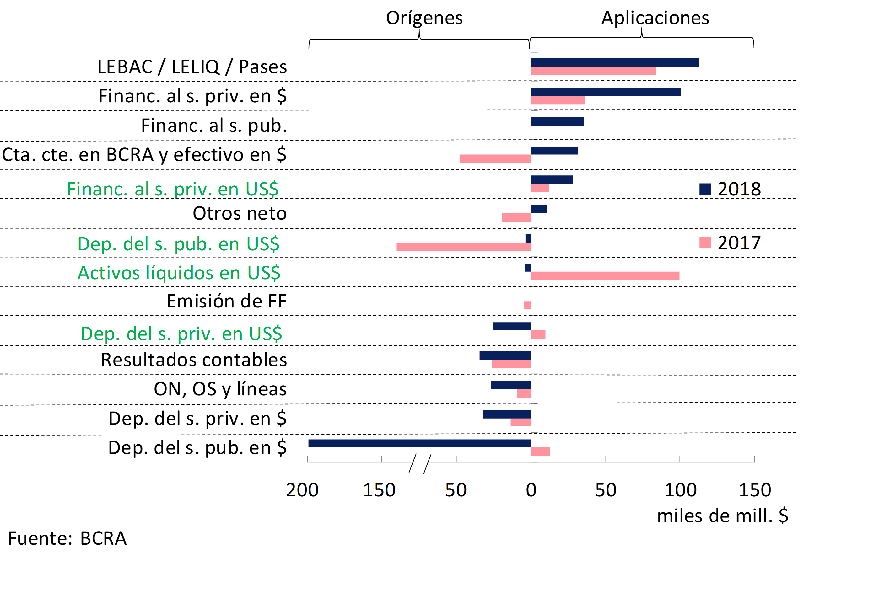 En base a la estimación del flujo de fondos mensual para el sistema financiero, la reducción de las tenencias de instrumentos del BCRA ($35.000 millones) y el aumento de los depósitos del sector privado en pesos ($34.000 millones) resultaron las principales fuentes de fondeo para los bancos. Estos recursos se canalizaron mayormente a aumentar el financiamiento en pesos al sector privado ($55.000 millones) y, en menor medida, a reducir el saldo de depósitos en pesos del sector público ($25.000 millones).