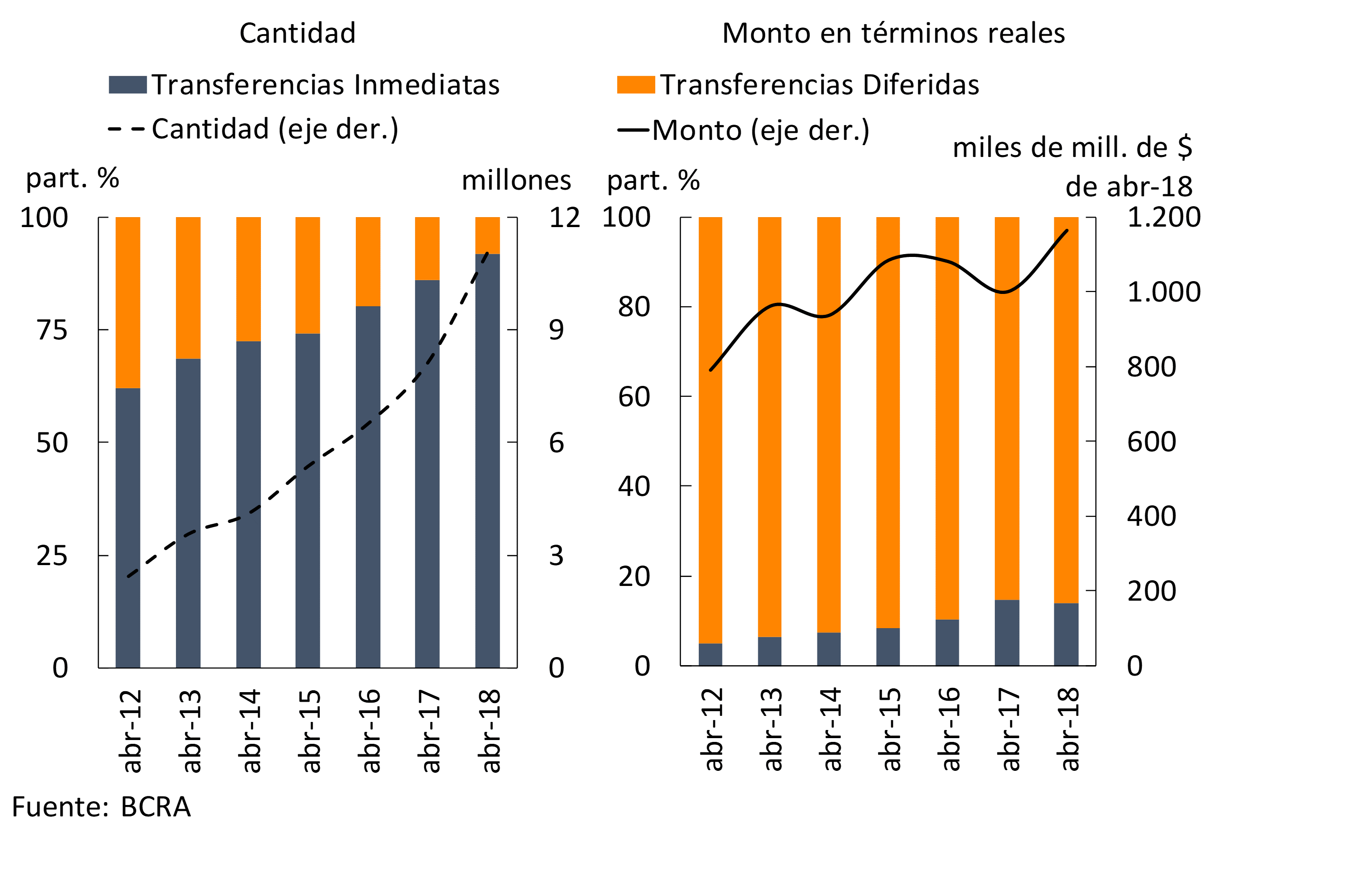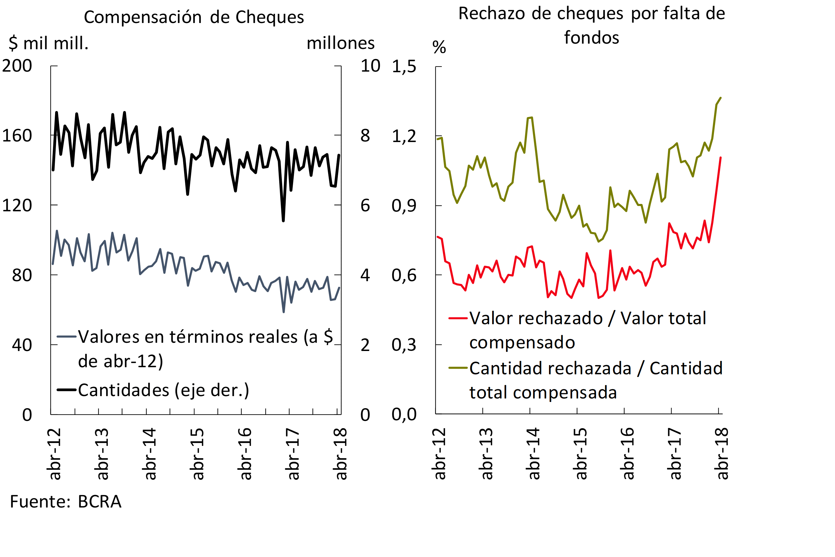 En cuanto al desempeño del sistema de pagos, en el comienzo de 2018 continuaron creciendo las transferencias a terceros10 —tanto en monto como en cantidad de operaciones—, impulsadas fundamentalmente por las inmediatas. Con datos a abril, estas últimas crecieron 10,6% i.a. en valores reales y 45,3% i.a. en cantidad (ver Gráfico 3). En contraposición y en línea con lo observado en los últimos años, en abril la compensación de cheques se incrementó levemente con respecto al mes anterior. Ajustado por inflación, los valores resultaron 13,5% superiores a los de abril de 2017 (ver Gráfico 4), en tanto que las cantidades aumentaron 15,8% i.a. Por su parte, en el cuarto mes del año el ratio de rechazo de cheques por falta de fondos se incrementó en valores y en cantidades, manteniéndose de todas formas en valores acotados, ya que alcanzó un 1,11% y 1,36% respectivamente.