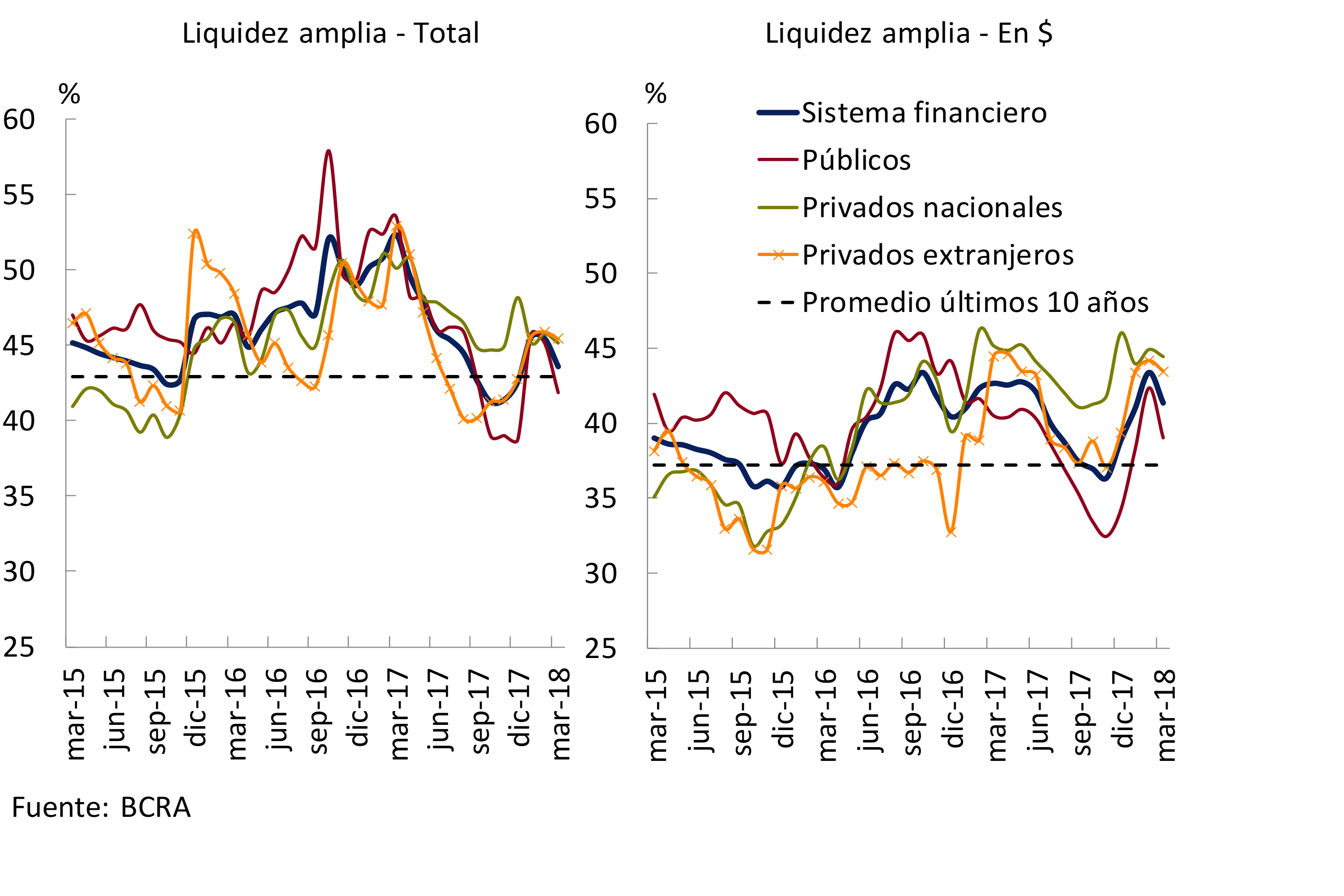 • En marzo los indicadores de liquidez del conjunto de bancos se redujeron levemente. El ratio amplio de liquidez del sistema financiero —incluye LEBAC, LELIQ y pases con el BCRA— se redujo 1,9 p.p. hasta ubicarse en 43,6% de los depósitos (-8,8 p.p. en una comparación interanual). A su vez, la liquidez amplia en pesos del conjunto de las entidades financieras totalizó 41,4%, 2 p.p. por debajo del valor registrado en febrero. No obstante, estos indicadores se ubicaron por encima del promedio de los últimos 10 años, situación que también se verificó en el grupo de bancos públicos y en los privados. Por su parte, el ratio de liquidez en sentido más estricto —excluye LEBAC, LELIQ y pases— se redujo 0,5 p.p. de los depósitos en marzo, hasta alcanzar 23,8%.