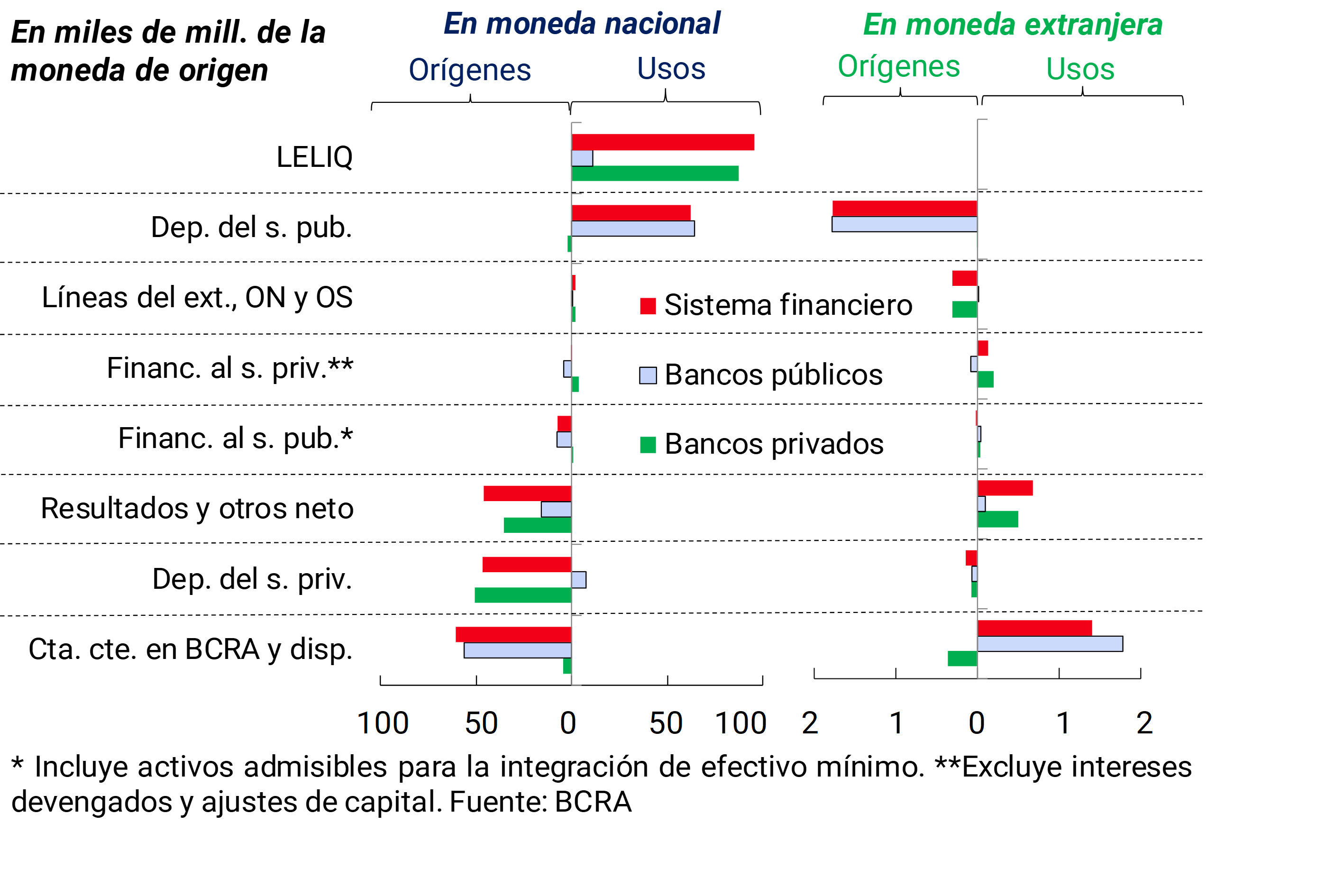 De acuerdo al flujo de fondos estimado para marzo,2 entre las partidas en moneda nacional las fuentes de recursos más relevantes fueron la reducción del saldo de las cuentas corrientes en el BCRA —especialmente en bancos públicos— y el aumento de los depósitos del sector privado —principalmente en bancos privados— (ver Gráfico 1). Estos fondos se aplicaron mayormente a aumentar las tenencias de LELIQ — en bancos privados— y a reducir el saldo de depósitos del sector público —en bancos públicos—. Considerando el segmento denominado en moneda extranjera, en marzo el principal origen de fondos fue el aumento de los depósitos del sector público, mientras que el uso de recursos más destacado fue el incremento de la liquidez, ambos movimientos estuvieron explicados fundamentalmente por los bancos públicos.