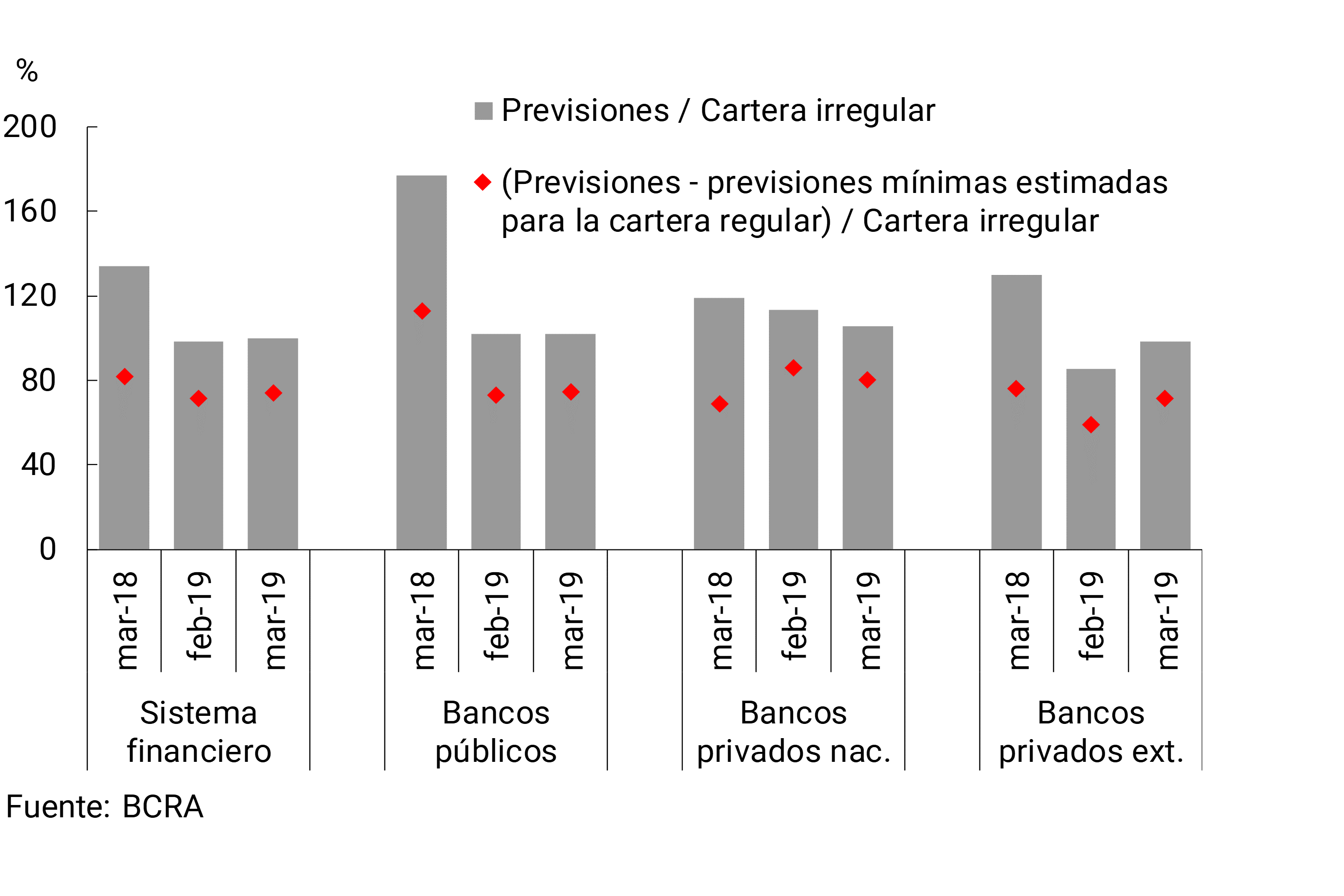 Se estima que a nivel agregado el saldo de previsiones constituidas para los créditos en situación irregular representó 74% de dicha cartera en marzo (ver Gráfico 11), muy por encima del mínimo exigido regulatoriamente (estimado en 44% de la cartera irregular). Considerando el saldo de previsiones contables totales (es decir, las adjudicadas tanto a la cartera regular como a la irregular), en el mes el previsionamiento agregado representó un monto equivalente a 100% de la cartera irregular al sector privado.