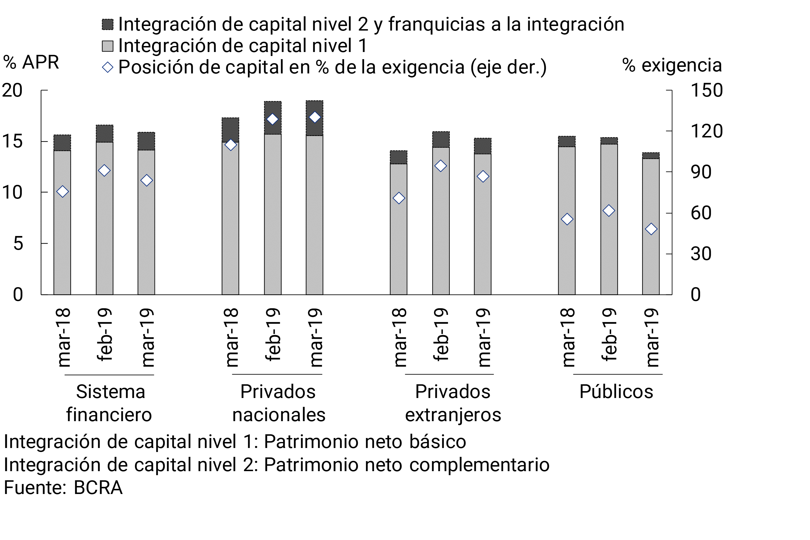 En marzo los ratios de solvencia del sistema financiero agregado continuaron en niveles elevados. La integración de capital representó 15,9% de los activos ponderados por riesgo (APR) en el cierre del primer trimestre de 2019 (ver Gráfico 12), levemente menor que en febrero pasado, aunque superior al registro del mismo mes del año pasado. En el período el exceso de integración de capital alcanzó 84% de la exigencia normativa.