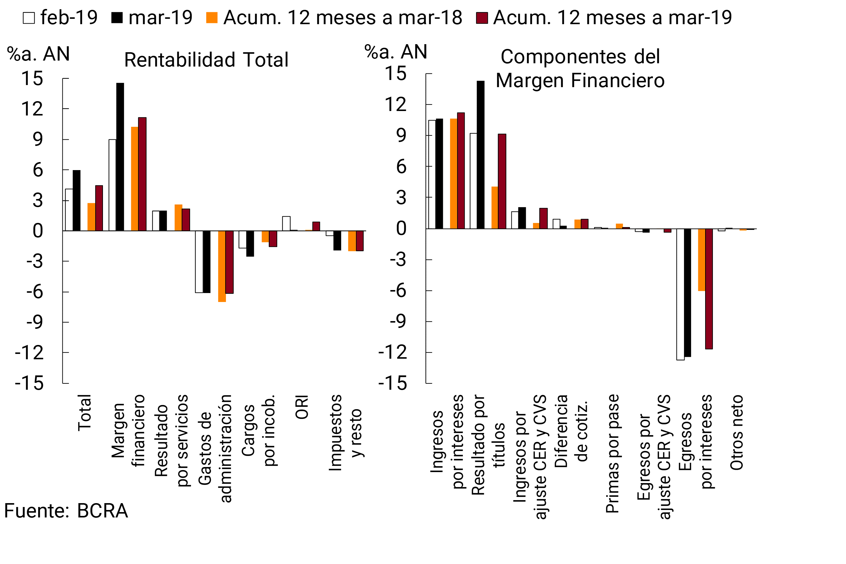 Los cargos por incobrabilidad se incrementaron en marzo, hasta 2,5%a. del activo (1,6% del activo en el acumulado de 12 meses, +0,5 p.p. i.a.). Los gastos de administración totalizaron 6,1%a. del activo en el mes, sin cambios significativos respecto a febrero (6,2% del activo en los últimos 12 meses, -0,8 p.p. i.a.).