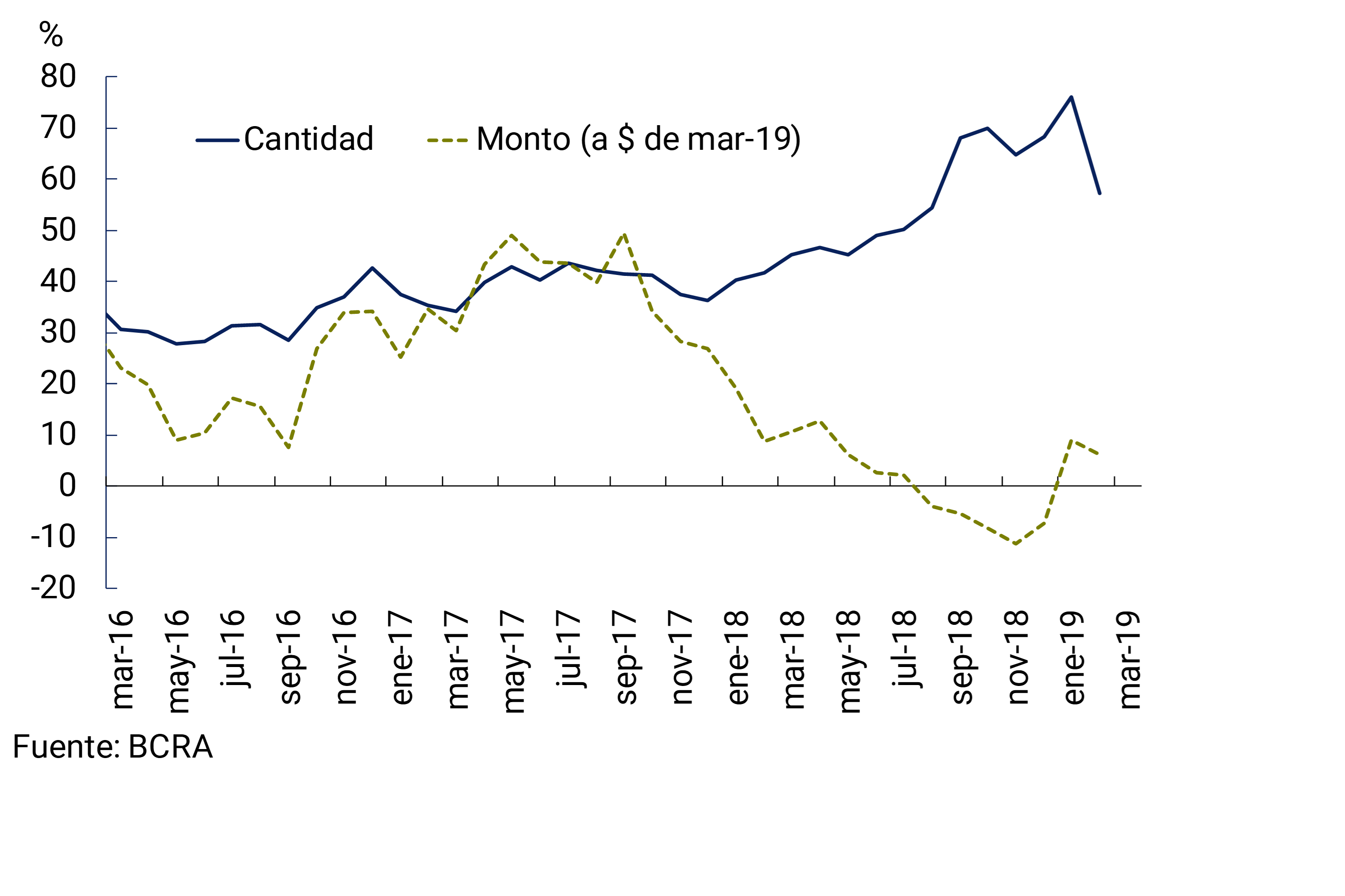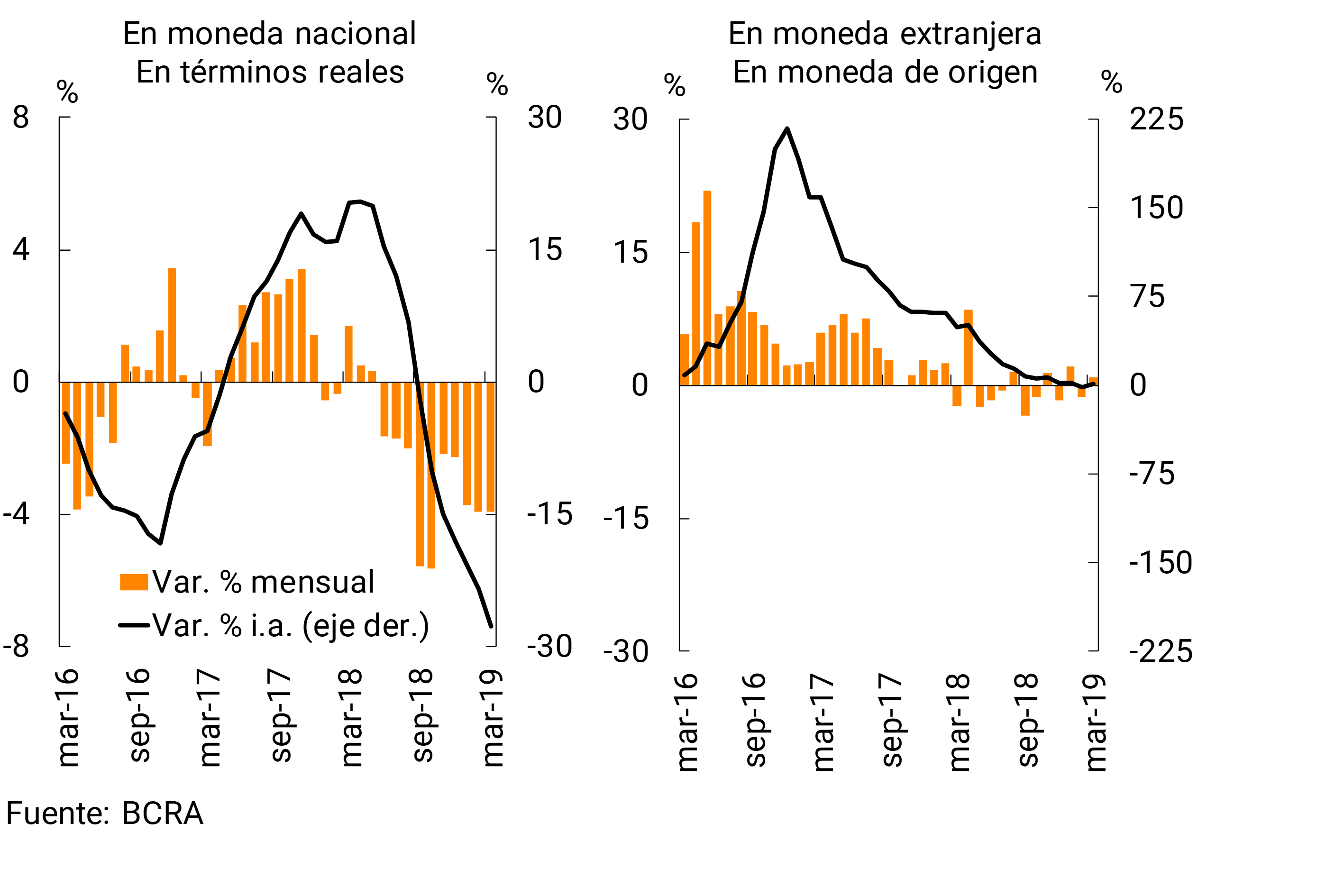 El saldo de crédito total (en moneda nacional y extranjera) a las empresas se incrementó 1,2% real con respecto a febrero (+6% en términos nominales).9 En comparación con marzo de 2018, el saldo de financiamiento a las empresas disminuyó 13% en términos reales. Por su parte, el saldo de crédito a las familias cayó 3,2% real con respecto a febrero (+1,3% nominal). En términos interanuales los préstamos a las familias se redujeron 17,7% real.10