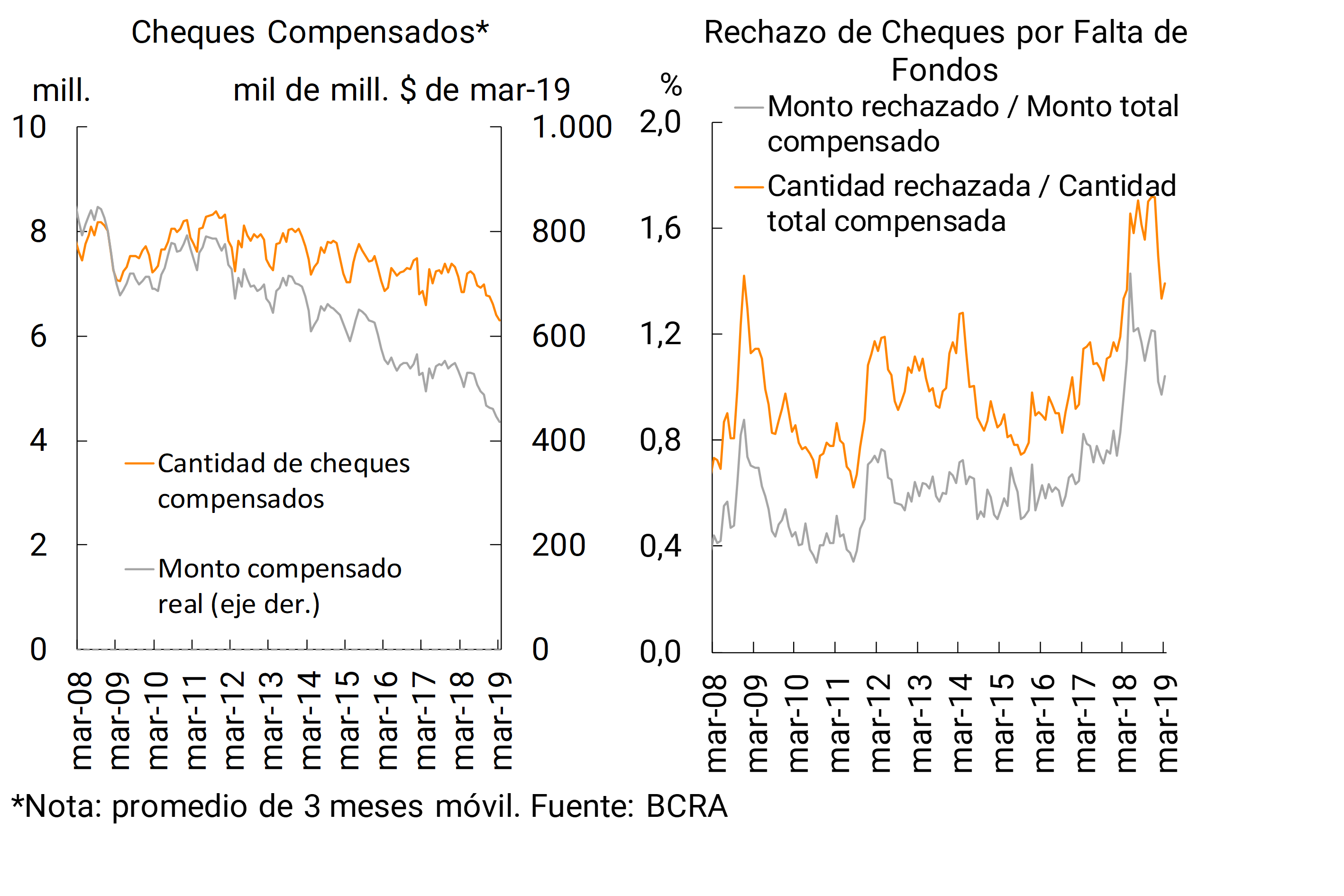 En términos de la operatoria del Sistema Nacional de Pagos, las transferencias inmediatas de fondos aumentaron, tanto en el mes (+5,3% para cantidades y +6,1% real para valores) como en relación a marzo de 2018 (+57,2% i.a. para el número de operaciones y +6,1% i.a. en términos reales, ver Gráfico 3).3 En el tercer mes del año el volumen de compensación de cheques continuó reduciéndose, mientras que el ratio de rechazo de cheques por falta de fondos en términos del total compensado aumentó levemente en el mes, si bien se mantuvo por debajo de los valores de fines de 2018 (ver Gráfico 4).