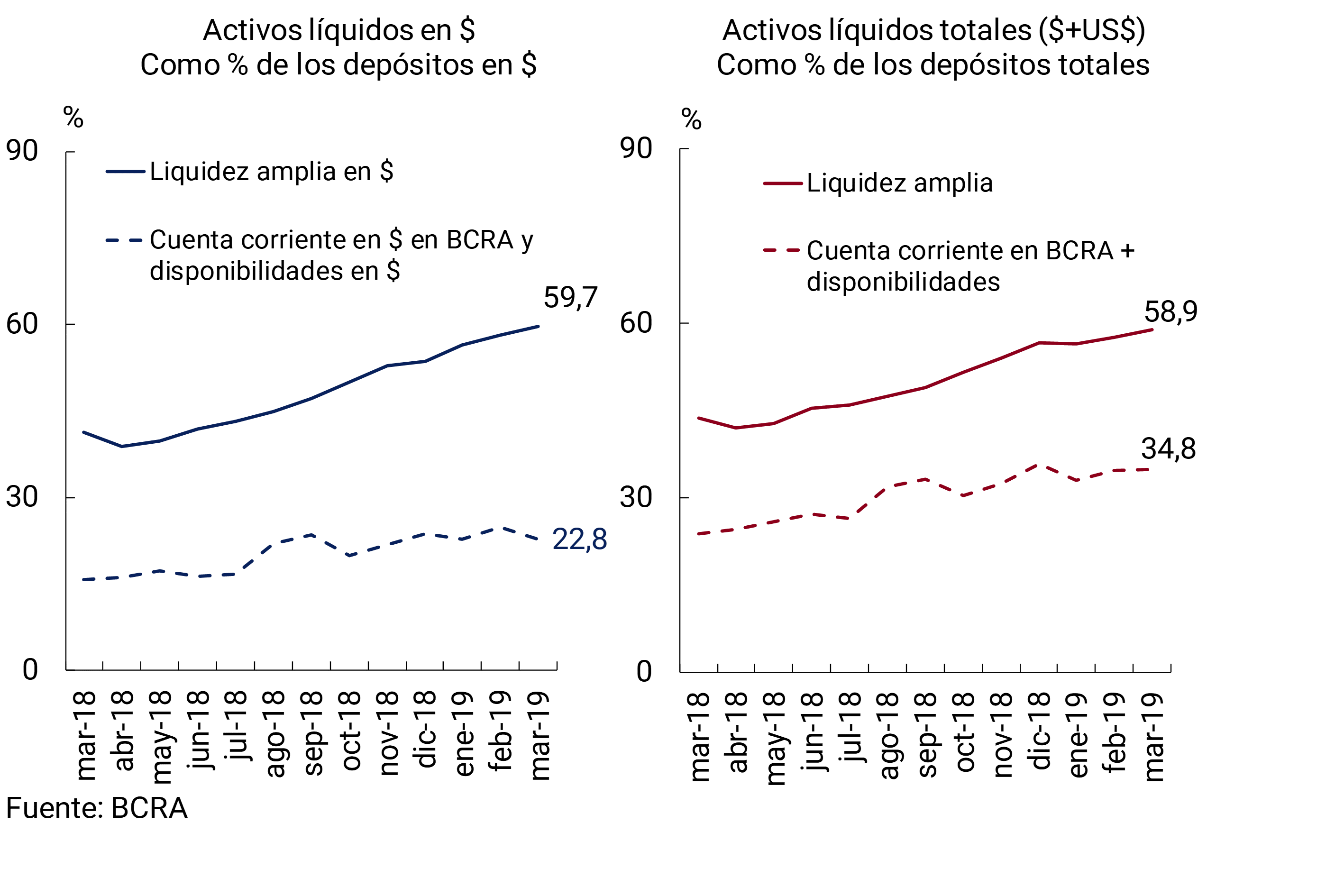 • El indicador amplio de liquidez se ubicó en 58,9% de los depósitos totales en marzo (59,7% para el segmento en pesos), 1,2 p.p. más que en febrero (+1,5 p.p. para las partidas en pesos). En los últimos 12 meses, la liquidez amplia creció 15,2 p.p. de los depósitos (+18,4 p.p. para el ratio en pesos). La liquidez en moneda extranjera alcanzó 57,3% de los depósitos en igual denominación.