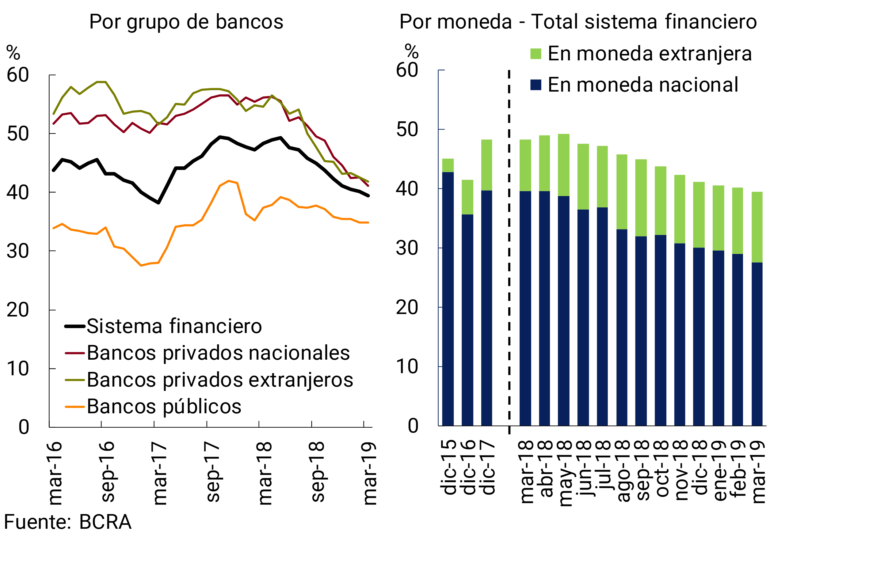 • El saldo de crédito en pesos al sector privado expresado en términos reales disminuyó en marzo respecto al mes anterior (+0,6% nominal) y acumuló una reducción de 27,7% i.a. Por su parte, el crédito en moneda extranjera al sector privado se incrementó levemente en el mes y con respecto a marzo de 2018 (en moneda de origen). En el cierre del primer trimestre de 2019 el crédito al sector privado representó 39,4% del activo bancario total (cayendo levemente con respecto al mes anterior y -8,8 p.p. i.a.).