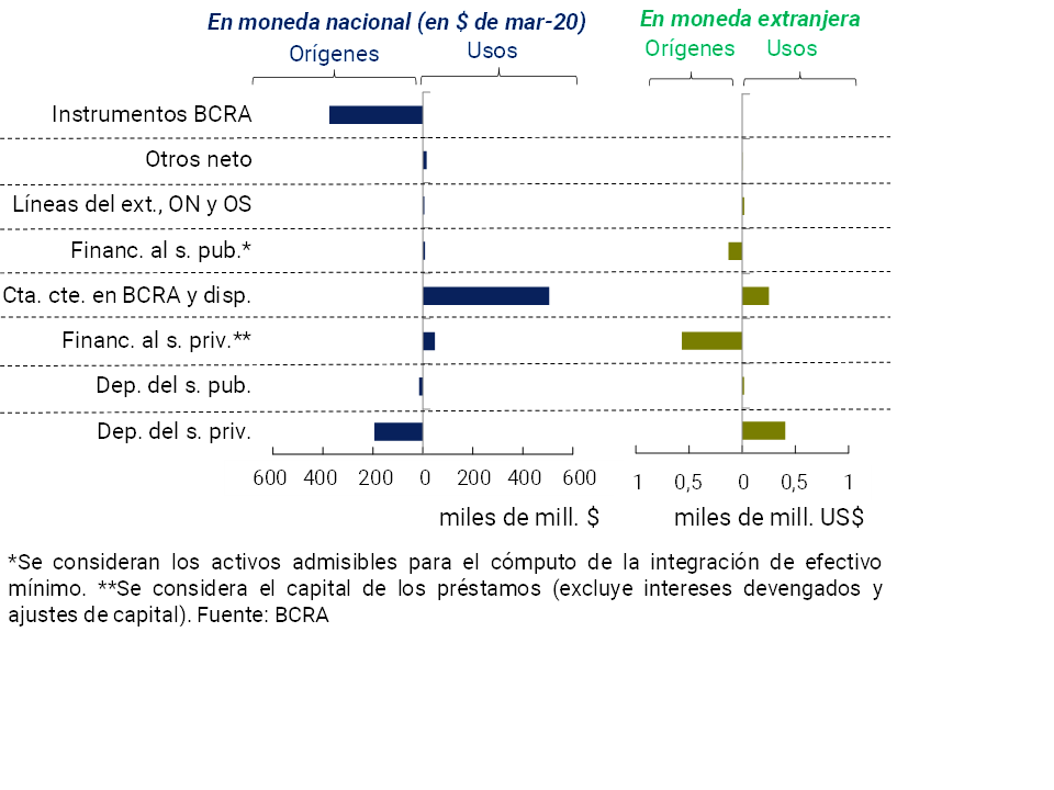 En marzo la actividad del sistema financiero se dio en un marco atípico, fundamentalmente a partir de la medida de “aislamiento social, preventivo y obligatorio” (ASPO)dispuesto a partir del día 20 frente a los efectos de la pandemia de COVID-19.En este contexto, de acuerdo al flujo de fondos estimado para las partidas en moneda nacional1, entre puntas de mes la reducción de las tenencias de instrumentos del BCRA y el aumento de los depósitos del sector privado fueron los principales orígenes de recursos para el sistema financiero (Ver Gráfico 1). Estos fondos se aplicaron fundamentalmente a incrementar el saldo de las cuentas corrientes que los bancos tienen en el BCRA y, en menor medida, a aumentar el crédito al sector privado. Estos movimientos se verificaron en todos los grupos de bancos. Por su parte, con relación a los rubros en moneda extranjera, la disminución del crédito al sector privado resultó el origen de fondos más destacado en el mes. La reducción de los depósitos del sector privado y el aumento de la liquidez fueron las principales aplicaciones de recursos en moneda extranjera durante marzo. La dinámica de estos rubros se reflejó en todos los grupos de bancos.