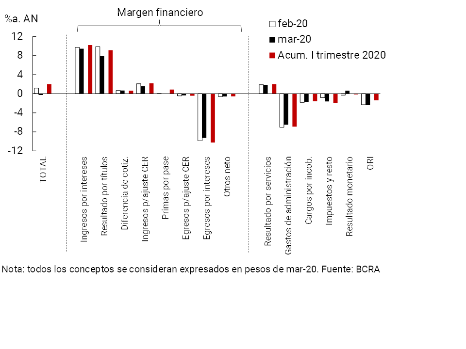 11En el numerador del ROA y del ROE del primer trimestre de 2020 se considera los resultados acumulados a marzo, expresados a precios de ese mes. Para construir el denominador de ambos indicadores, se toma el promedio de los activos y del patrimonio neto respectivamente, ambos a precios de marzo.