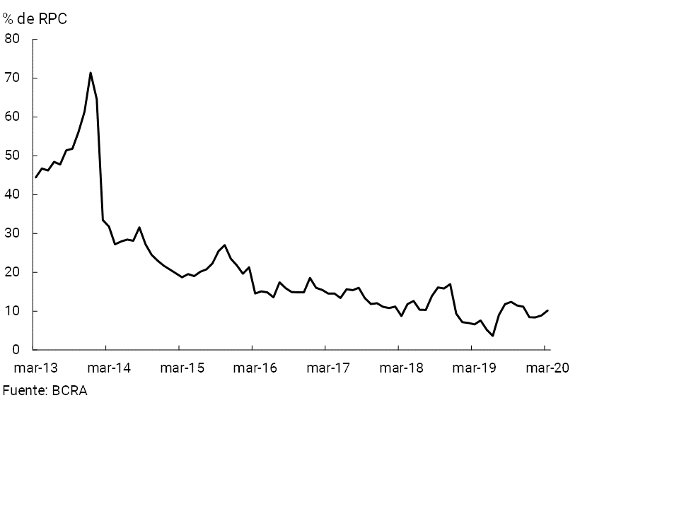 En los últimos 12 meses, los depósitos del sector privado en pesos aumentaron 7,3% real (+59,1% i.a. nominal), con un incremento de29,8% i.a. en las cuentas a la vista (+92,5% i.a. nominal) y una reducción de 14% i.a. en los depósitos a plazo (+26,2% i.a. nominal). Por su parte, los depósitos del sector privado en moneda extranjera acumularon una caída interanual de 39% —en moneda de origen—. Los depósitos totales del sector público disminuyeron en términos reales con respecto a marzo de 2019. De esta manera, el saldo total de depósitos se redujo 13% i.a. real (+29% i.a. nominal)