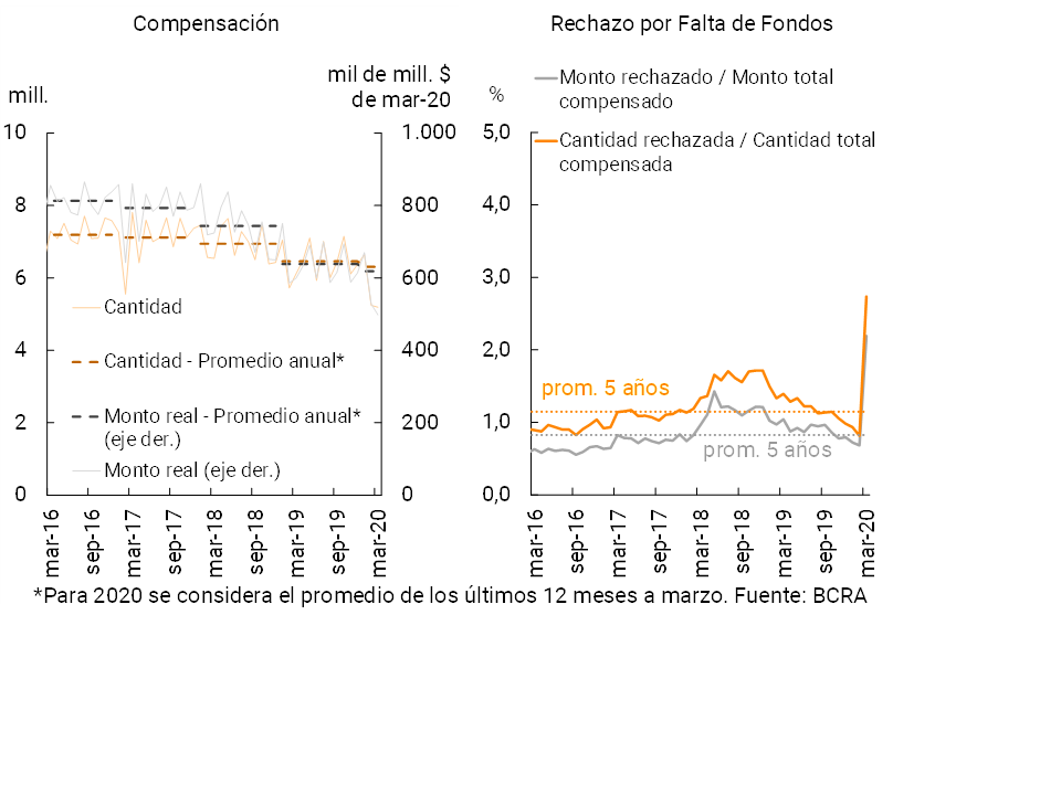 2 Cabe mencionar que en marzo la operatoria de compensación de cheques se vio afectada en parte por las disposiciones adoptadas en el marco de la emergencia sanitaria. A través de la “Com. A 6942″ y “Com. A 6944″ el BCRA estableció, entre otras medidas, que para el período abarcado entre el 20 y 25 de marzo se interrumpiera transitoriamente las sesiones de compensación electrónica de cheques.